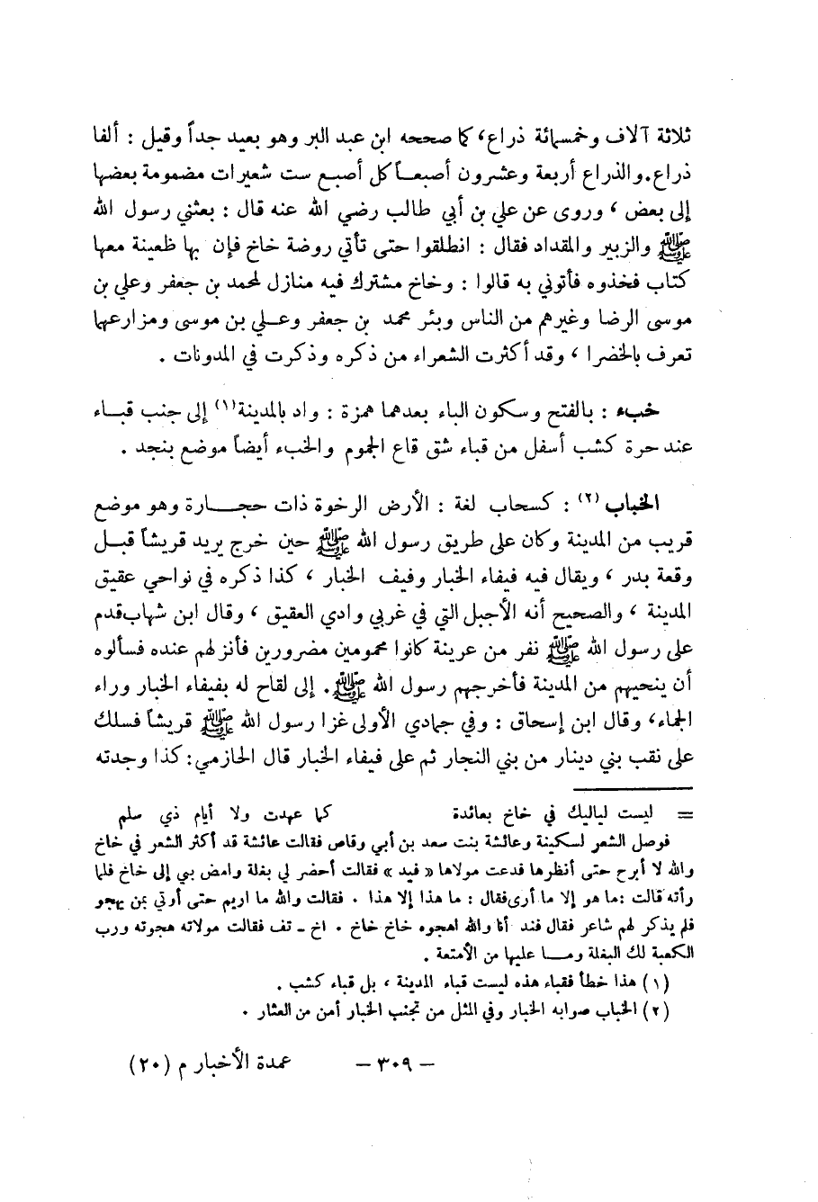 الخباب (2): كسحاب لغة: الأرض الرخوة ذات حجارة ومو موضع قريب من المدينة وكان على طريق رسول الله صلى الله عليه وسلم حين خرج يريد قريشا قبل وقعة بدر، ويقال فيه فيفاء الخبار، كذا ذكره في نواحي عقيق المدينة، والصحيح أنه الأجبل التي في غربي وادي العقيق، وقال ابن شهاب قدم على رسول الله صلى الله عليه وسلم نفر من عريبة كانوا محمومين مضرورين فأنزلهم عنده فسألوه أن ينحيهم من المدينة فأخرجهم رسول الله صلى الله عليه وسلم.
