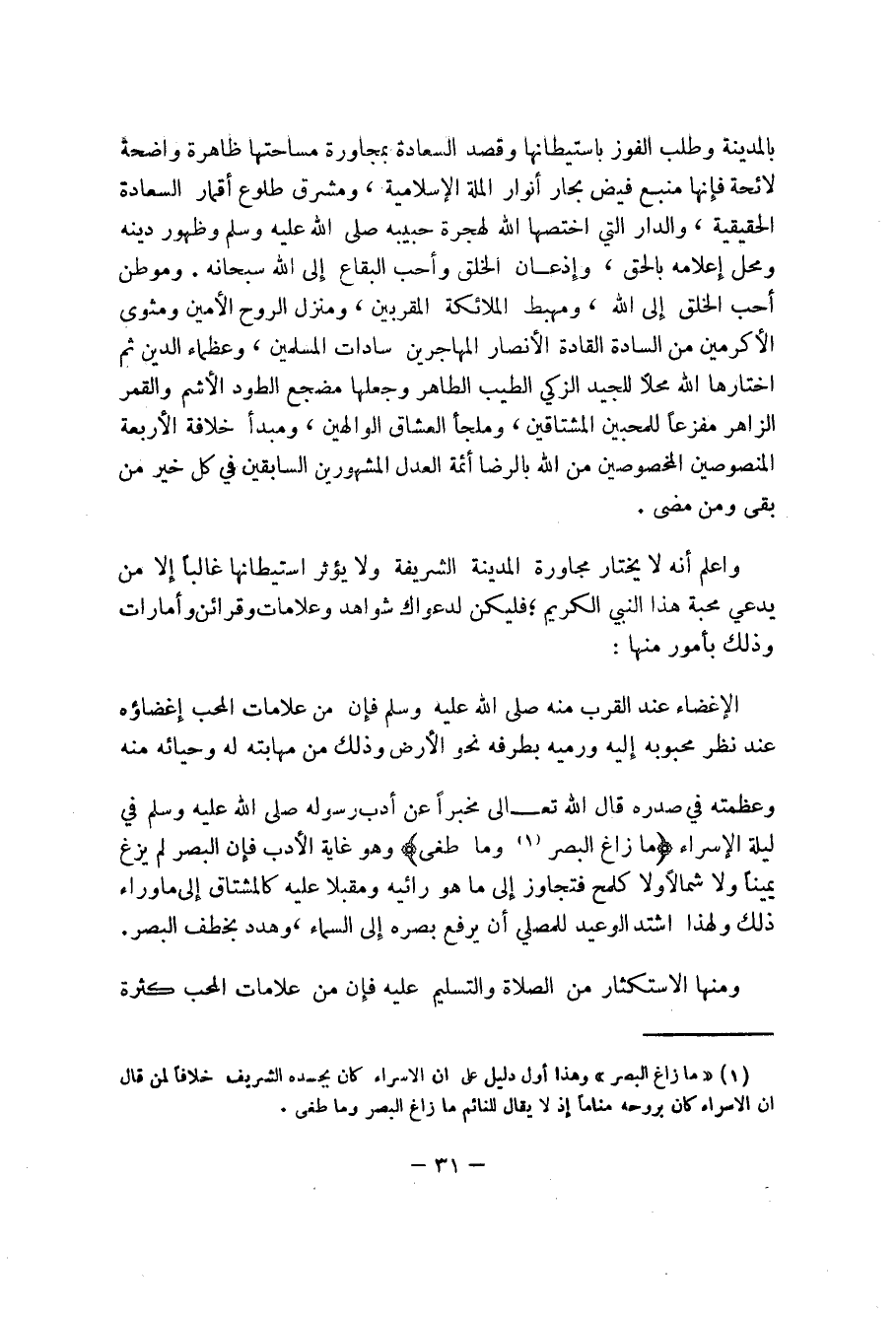 واعلم أنه لا يختار مجاورة المدينة الشريفة ولا يؤثر استطيانها غالباً إلا من يدعي محبة هذا النبي الكريم؛ فليكن لدعواك شواهد وعلامات وقرائن وأمارات وذلك بأمور منها: الإغضاء عند القرب منه صلى الله عليه وسلم فإن من علامات المحب إغضاؤه عند نظر محبوبه إليه ورميه بطرفه نحو الأرض وذلك من مهابته له وحيائه منه وعظمته في صدره قال تعالى مخبراً عن أدب رسوله صلى الله عليه وسلم في ليلة الإسراء (ما زاغ البصر (1) وما طغى) وهو غاية الأدب فإن البصر لم يزغ يميناً ولا شمالاً ولا كلمح فتجاوز إلى ما هو رائيه ومقبلا عليه كالمشتاق إلى ما وراء ذلك ولهذا اشتد الوعيد للمصلي أن يرفع بصره إلى السماء، وهدد بخطف البصر.