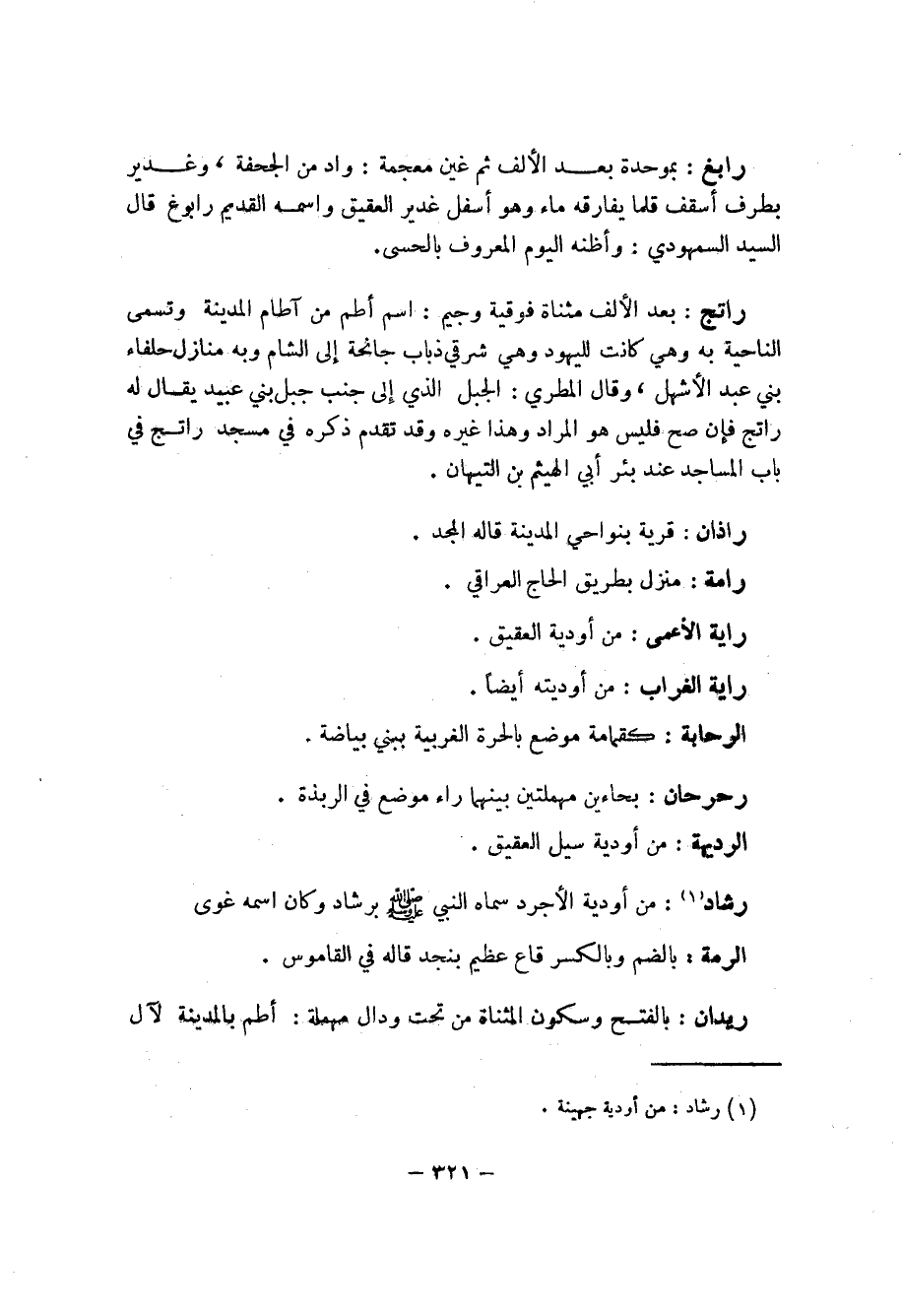 321 ... رابغ: بموحدة بعد الألف ثم غين معجمة: واد من الجخفة، وغدير بطرف أسقف فلما يفارقه ماء وهو أسفل غدير العقيق واسمه القديم رابغ قال السيد السمهودي: وأظنه اليوم المعروف بالحسى.
