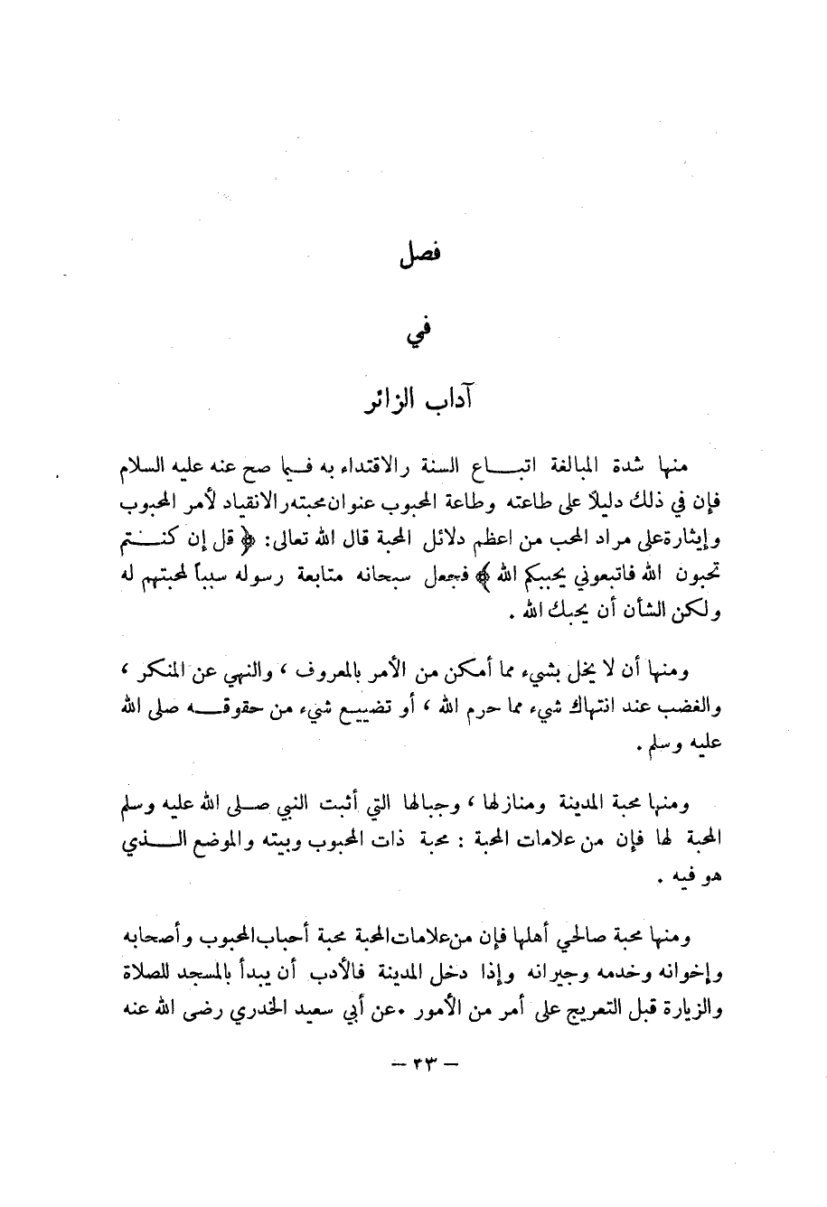منها شدة المبالغة اتباع السنة وا لاقتداء به فيما صح عنه عليه السلام فإن في ذلك دليلاً على طاعته وطاعة المحبوب عنوان محبته والانقياد لأمر المحبوب وإيثارة على مراد الحب من اعظم دلائل المحبة قال الله تعالى: (قل إن كنتم تحبون الله فاتبعوني يحببكم الله) فجعل سبحانه متابعة رسوله سبباً لمحبتهم له ولكن الشأن أن يحبك الله.