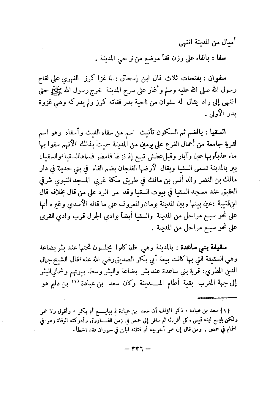 (1) سعد بن عبادة: ذكر المؤلف أن سعد بن عبادة لم يبايع أبا بكر، وأقول ولا عمر ولكن بايع ابنه قيس وكل أقربائه ثم سافر إلى حمص في زمن الفاروق وادركته الوفاة وهو في الحمام في حمص.