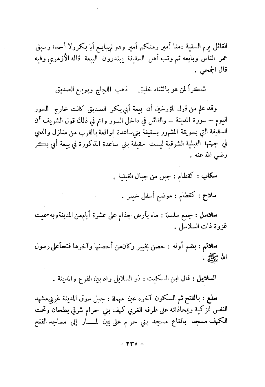 337 ... القائل برم السقية: منا أمير ومنكم أمير وهو لم يبايع أبا بكر ولا أحدا وسبق عمر الناس وبايعه ثم وثب وبايعه ثم وثب أهل السقيفة يبتدرون البيعة قاله الأزهري وفيه قال الجمحي.