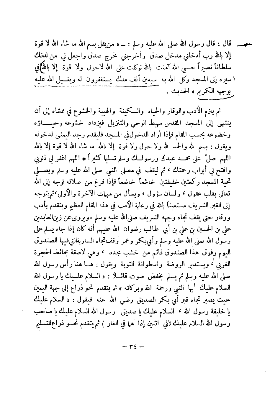 ثم يلزم الأدب والقاور والحياء والهيبة والخشوع في ممشاه إلى أن ينتهي إلى المسجد المقدس مهبط الوحي والتزيل فيزداد خشوعه وحياؤه وخضوعه بحسب المقام فإذا أراد الدخول في المسجد فليقدم رجله اليمنى لدخوله ويقول: بسم الله والحمد للله ولا حول ولا قوة إلا بالله ما شاء الله لا قوة إلا بالله اللهم صلّ هلى محمد عبدك ورسولك وسلك تسليما كثيراً* اللهم اغفر لي ذنوبي وافتح لي أبواب رحمتك، ثم ليقف في مصلى النبي صلى الله عليه وسلم ويصلي تحية المسجد ركعتين خفيفتين خاضعاً فإذا فرغ من صلاته توجه إلى الله تعالى بقلب عقول، ولسان سؤول، ويسأل من مهمات الآخرة والأولى، ثم يتوجه إلى القبر الشريف مستعينا بالله في رعاية الأدب في هذا المقام العظيم ويتقدم بأدب ووقار حتى يقف تجاه وجهه الشريف صلى الله عليه وسلم0 ويروى عن زين العابدين علي بن الحسين بن علي بن أبي طالب رضوان الله عليهم أنه كان إذا جاء يسلم على رسول الله صلى الله عليه وسلم وأبي بكر وعمر وقف تجاه السارية التي فيها الصندوق اليوم وفوق هذا الصندوق قائم من خشب مجدد، وهي لاصقة بحائط الحجرة الغربي، ويستدبر الروضة واسطوانة التوبة ويقول: ها هنا رأس رسول الله صلى الله عليه وسلم ثم يسلم بخفض صوت قائلاً: (السلام عليك يا رسول الله السلام عليكم أيها النبي ورحمة الله وبركاته) ثم يتقدم نحو ذراع إلى جهة اليمين حيث يصير تجاه قبر أبي بكر الصديق رضي الله عنه فيقول: (السلام عليك يا خليفة رسول اله، والسلام عليك يا صديق رسول الله السلام عليكم يا صاحب رسول الله السلام عليك ثاني اثنين إذ هما في الغار) ثم يتقدم نحو ذراع للتسليم