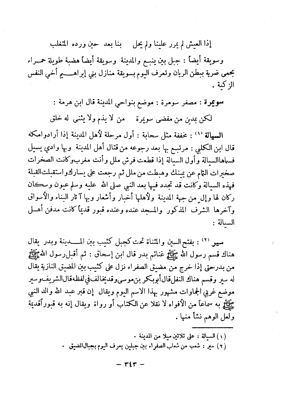 سير (2): بفتح السين والمثناة تحت كجبل كثيب بين المدينة وبدر يقال هناك قسم رسول الله صلى الله عليه وسلم غنائم بدر قال ابن إسحاق: ثم أقبل رسول الله صلى الله عليه وسلم من بدر حتى إذا خرج من مضيق الصفراء نزل على كثيب بين المضيق النازية يقال له سير وقسم هناك قال أبو بكر بن موسى وقد يخالف في لافظه قال الشريف وسير موضع غربي الجماوات مشهور بهذا الاسم اليوم ويقال إن قبر عبد الله والد النبي صلى الله عليه وسلم به سماعاً من الأفواه لا نقلا عن الكتاب أو رواة ويقال إنه من قبور اًقديمة ولعل الوهم نشأ منها ....