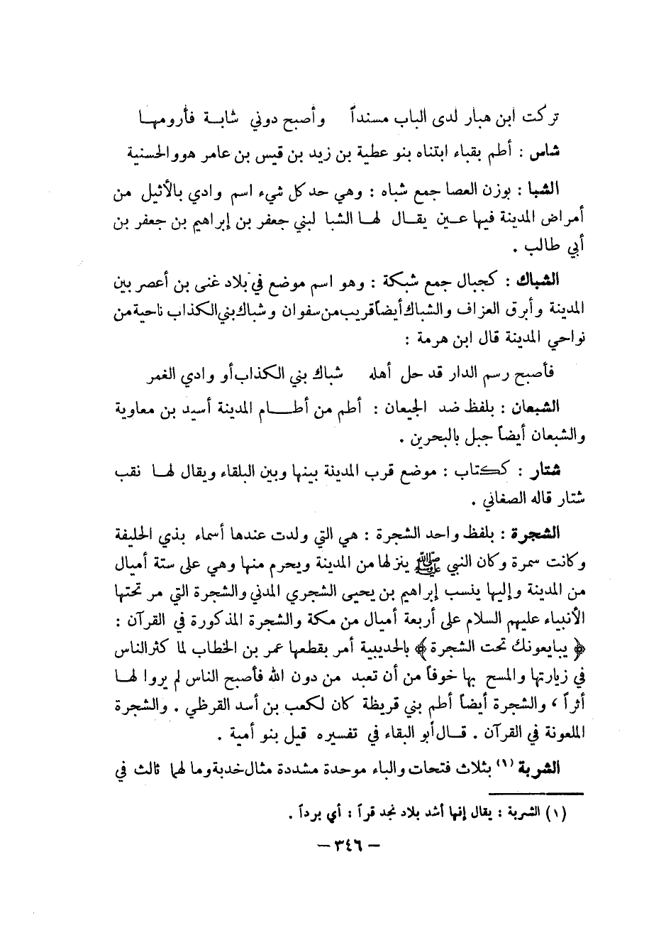 الشجرة: بلفظ واحد الشجرة: هي التي ولدت عندها أسماء بذي الحليفة وكانت سمرة وكان النبي صلى الله عليه وسلم ينزلها من المدينة ويحرم منها وهي على ستة أميال من المدينة وإليها ينسب إبراهيم بن يحيى الشجري المدني والشجرة والتي مر تحتها الأنبياء عليهم السلام على أربعة من مكة والشجرة المذكورة في القرآن: (يبايعونك تحت الشجرة) بالحديبية أمر بقطعها عمر بن الخطاب لما كثر الناس في زيارتها والمسح بها خوفاً من أن تعبد من دون الله فأصبح الناس لم يروا لها أثراً، والشجرة أيضاً أطم بني قريظة كان لكعب بن أسد القرظي. والشجرة الملعونة في القرآن. قال أبو البقاء في تفسيره قبل بنو أمية.