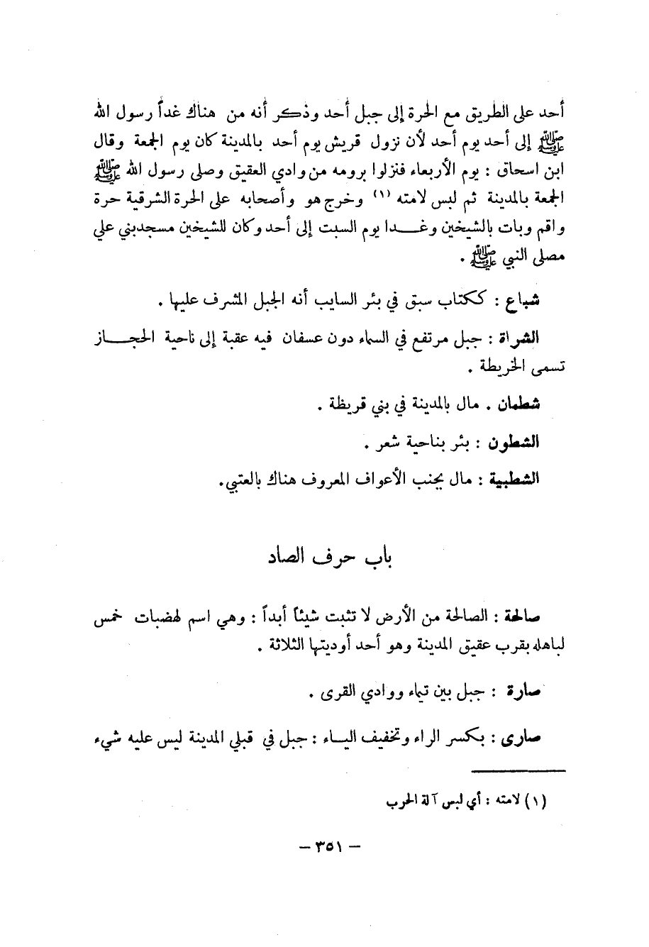 أحد على الطريق مع الحرة إلى جبل أحد وذكر أنه من هناك غداً رسول الله صلى الله عليه وسلم إلى يوم أحد يوم أحد لأن نزول قريش يوم أحد بالمدينة كان يوم الجمعة قال ابن اسحاق: يوم الأربعاء فنزلوا برومه من وادي العقيق وصلى رسول الله صلى الله عليه وسلم الجمعة بالمدينة ثم لبس لامته (1) وخرج هو وأصحابه على الحرة الشرقية علي واقم وبات الشيخين وغدا يوم السبت إلى أحد وكان للشيخين مسجد بين علي مصلى النبي صلى الله عليه وسلم.