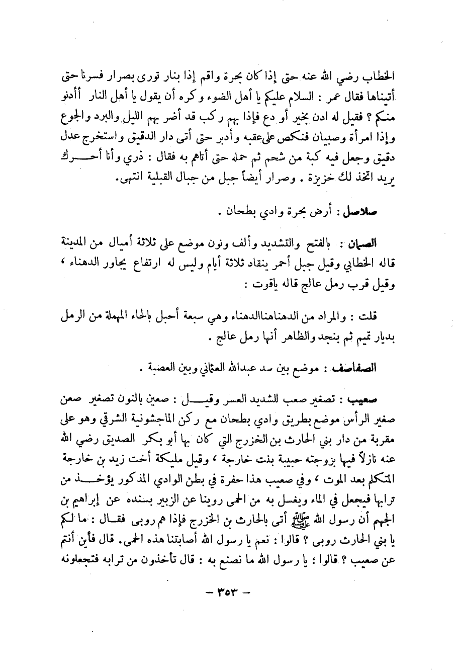 الصمان: بالفتح والتشديد وألف ونون موضع على ثلاثة أميال من المدينة قال الخطابي وقيل جبل أحمر بنقاد ثلاثة أيام وليس له ارتفاع يجاور الدهناء، وقيل قرب رمل عالج قاله ياقوت: قلت: والمراد من الدهنا هنا الدهناء وهي سبعة أحبل بالحاء المهملة من الرمل بديار تميم ثم بنجد والظاهر أنها رمل عالج.