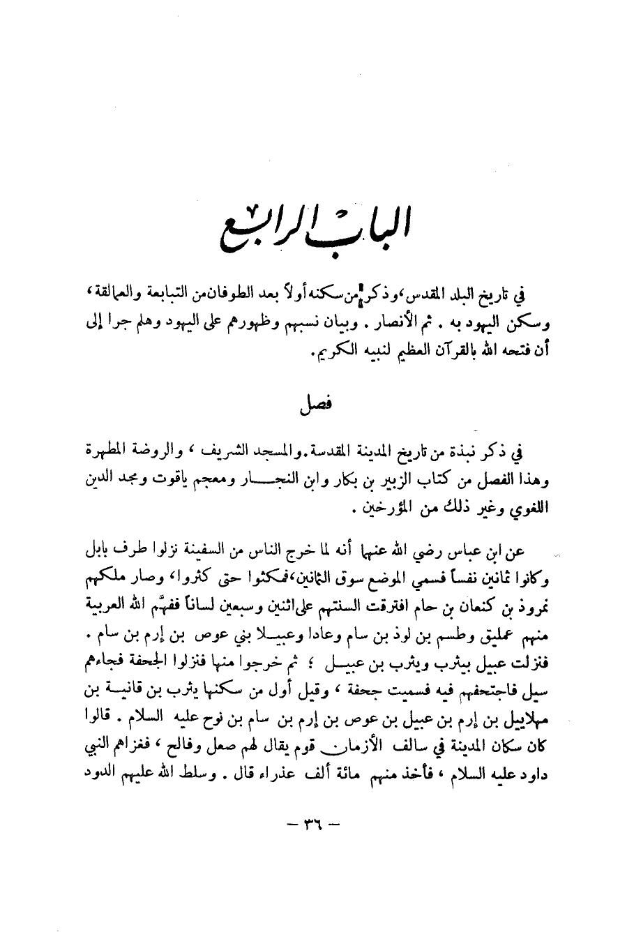 الباب الرابع في تاريخ اللبد المقدس، وذكر من سكنه أولاً بعد الطوفان من التابعة والعمالقة، وسكن اليهودية به.