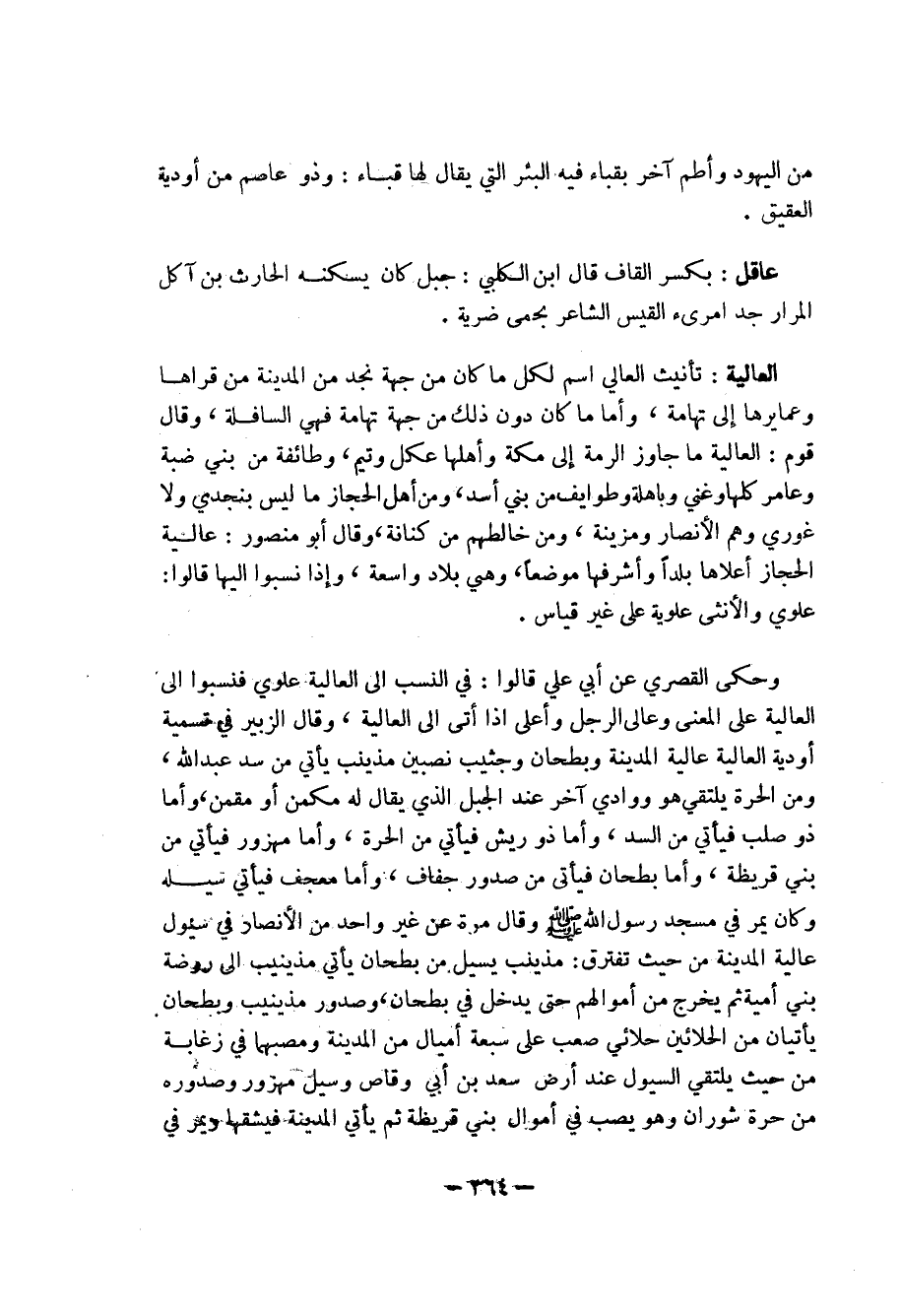 وحكى القصري عن أبي علي قالوا: في النسب الى العالية علوي فنسبوا الى العالية على المعنى وعالى الرجل وأعلى اذا اتى الى العالية، وقال الزبير في تسمية أودية العالية عالية المدينة وبطحان وجئيب نصبين مذينب يأتي من سد عبدالله، ومن الحرة يلتقي هو ووادي آخر عند الجبل الذي يقال له مكمن أو مقمن، وأما ذو صلب فيأتي من السد، وأما ذو ريش فيأتي من الحرة، وأما مهزور فيأتي من بني قريظة، وأما يطحان فيأتى من صدور وجفاف، وأما معجف فيأتي سيله وكان يمر في مسجد رسول الله صلى الله عليه وسلم وقال مرة عن غير واحد من الأنصار في سيول عالية المدينة من حيث تفترق: مذينب يسيل في بطحان يأتي مذينيب الى روضة بني أمية ثم يخرج من أموالهم حتى يدخل في بطحان، وصدور مذينيب وبطحان يأتيان من الحلائين حلائي صعب على سبعة أميال من المدينة ومصبهما في زغابة من حيث يلتقي السيول عند أرض سعد بن أبي وقاص وسيل مهزور وصدوره من حرة شوران وهو يصب في أموال بني قريظة ثم يأتب المدينة فيشقها ويمر في ...