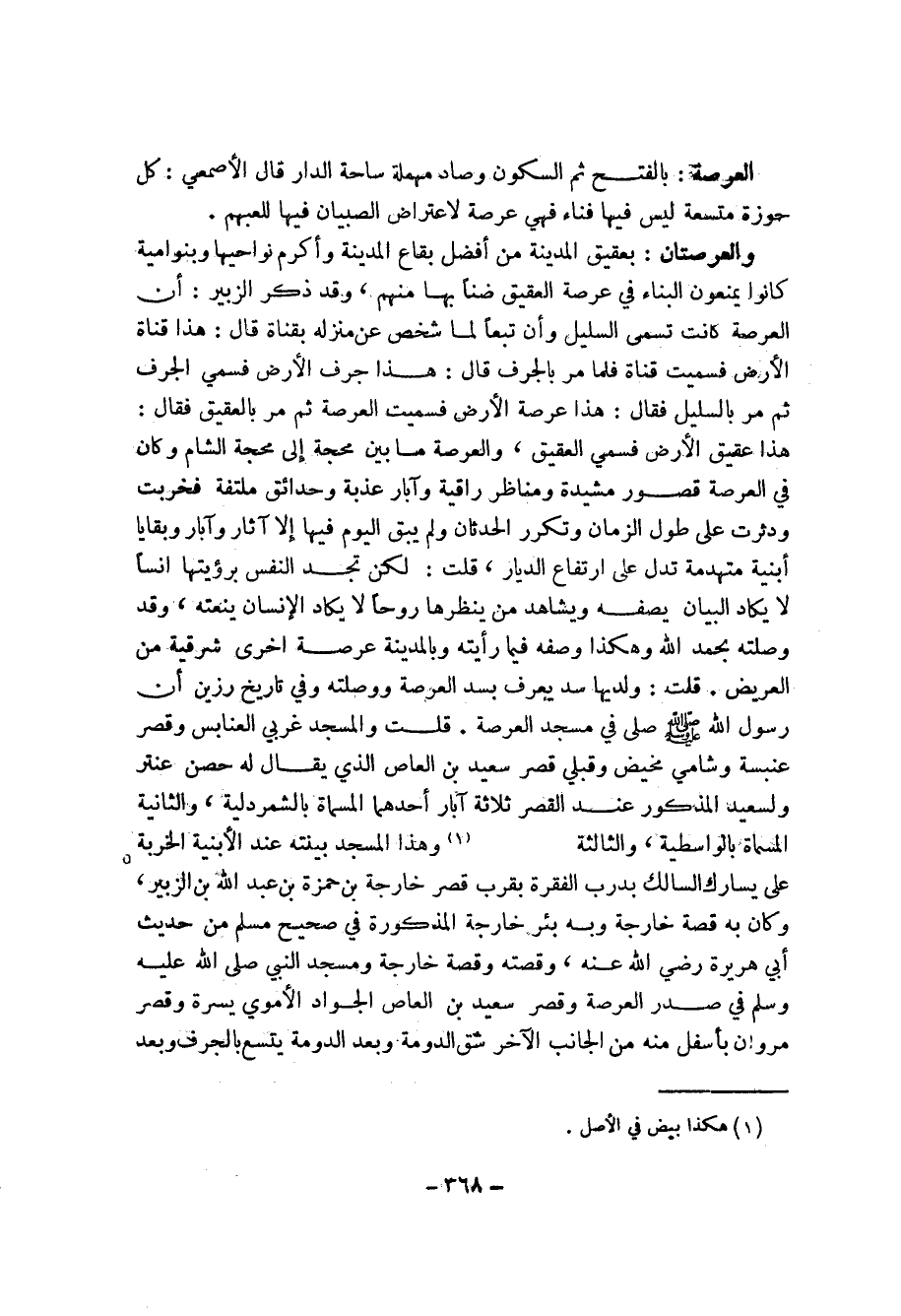 والعرصتان: بعقيق المدينة من أفضل بقاع المدينة وأكرم نواحيها وبنو امية كانوا يمنعون البناء في عرصة العقيق ضناً بها منهم، وقد ذكر الزبير: أن العرصة كانت تسمى السليل وأن تبعاً لما شخص عن منزله بقناة قال: هذا قناة الأرض فسميت قناة فلما مر بالجرف قال: هذا جرف الأرض فسمي الجرف ثم مر بالسليل فقال: هذا عرصة الأرض فسميت العرصة ثم مر بالعقيق فقال: هذا عقيق الأرض فمسي العقيق، والعرصة ما بين محجة الشام وكان في العرصة قصور مشيدة ومناظر راقية وآبار عذبة وحدائق ملتفة فخرجت ودثرت على طول الزمان وتكرر والحدثان لم يبق اليوم فيها إلا آثار وآبار وبقايا أبنية متهدمة تدل على ارتفاع الديار، قلت: لكن تجد النفس برؤيتها انساً لا يكاد البيان يصفه ويشاهد من ينظرها روحاً لا يكاد الإنسان ينعته، وقد وصلته بحمد الله وهكذا وصفه فيما رأيته وبالمدينة عرصة اخرى شرقية من العريض.