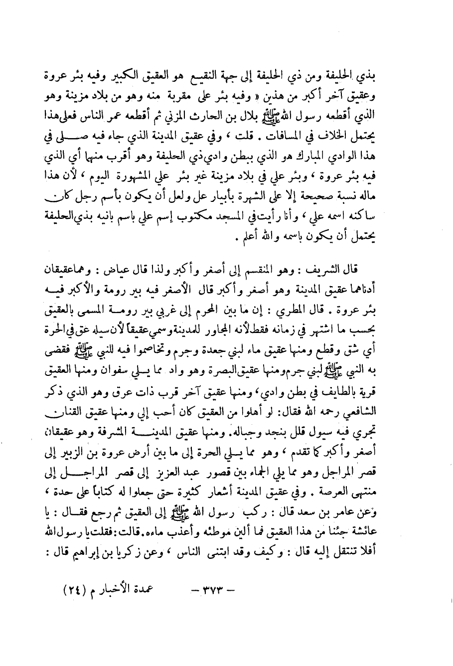 قال الشريف: وهو المنقسم إلى أصغر وأكبر ولذا قال عياض: وهما عقيقتان أدناهما عقيق المجينة وهو أصغر وأكبر قال الأصغر فيه بير رومة والأكبر فيه بئر عروة. قال المطري: إن ما بين المحرم إلى غربي رومة المسمى بالعقيق بحسب ما اشتهر في زمانه فقط لأنه المجاور للمدينة وسمي عقيقاً لأن سيله عق في الحرة أي شق وقطع ومنها عقيق ماء لبني جعدة وجرم تخاصموا فيه للنبي صلى الله عليه وسلم فقضى به النبي صلى الله عليه وسلم لبني جرم ومنها عقيق البصرة وهو واد مما يلي سفوان ومنها العقيق قرية بالطايف في بطن وادي، ومنها عقيق آخر قرب ذات عرق وهو الذي ذكر الشافعي رحمه الله فقال: لو أهلوا من العقيق كان أحب إلي ومنها عقيق القنان تجري فيه سيول قلل بنجد وجباله. ومنها عقيق المدينة المشرفة وهو عقيقان أصغر وأكبر كما تقدم، وهو مما يلي الحرة إلى ما بين أرض عروة بن الزبير إلى قصر المراجل وهو مما يلي الجماء بين قصور عبد العزيز إلى قصر المراجل إلى متنهى العرصة. وفي عقيق المدينة أشعار كثيرة حتى جعلوا له كتاباً على حدة، وعن عامر بن سعد قال: ركب رسول الله صلى الله عليه وسلم إلى العقيق ثم رجع فقال: يا عائشة جئنا من هذا العقيق فما ألين موطئه وأعذب ماءه. قالت: فقلت يا رسول الله أفلا تنتقل إليه قال: وكيف وقد ابتنى الناس، وعن زكريا بن إبراهيم قال: