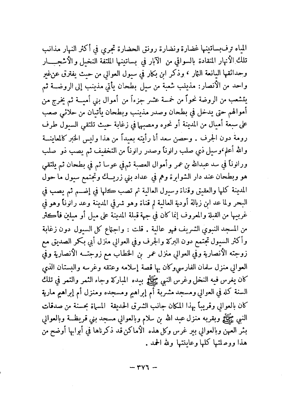 قلت: واجتماع كل السيول دون زغابة وأكثر السيول تجتمع دون البركة والجرف وفي العوالي منزل أبي بكر الصديق مع زوجته الأنصارية وفي العوالي منزل عمر بن الخطاب مع زوجته الأنصارية وفي العوالي منزل سلمان الفارسي وكان بها قصة إسلامية وعتقه وغرسه والبستان الذي كان يغرس فيه النخل وغرس النبي صلى الله عليه وسلم بيده المباركة وجاء الثمر والتمر في تلك السنة كله في العوالي ومسجد مشربة أم إبراهيم ومسجده ومنزل أم إبراهيم مارية كان بالعوالي وقريباً بهذا المكان جانب الشرق الحديقة المساماة بحسنة من صدقات النبي صلى الله عليه وسلم وبقربه منزل عبد الله بن سلام وبالعوالي مسجد بني قريظة وبالعوالي بئر العهن وبالعوالي بير غرس وكل هذه الأماكن قد ذكرناها في أبوابها أوضح من هذا ووصلتها كلها وعاينتها ولله الحمد.