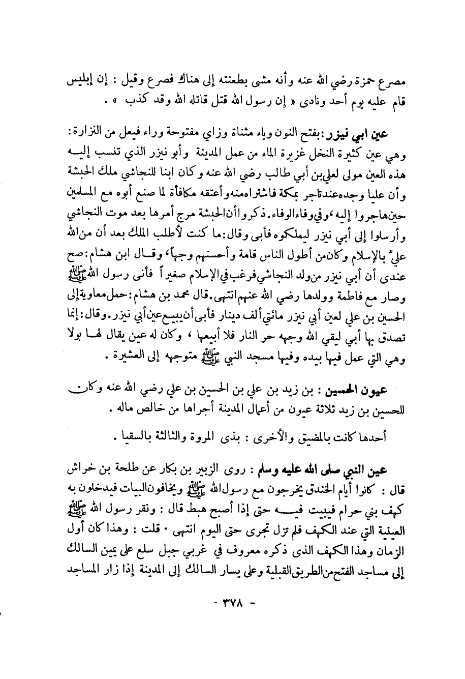 378 ... مصرع حمزة رضي الله عنه وأنه ةمشى بطعنته إلى هناك فصرع وقيل: إن إبليس قام عليه يوم أحد وتادى (إن رسولا الله قتل قاتله وقد كذب).