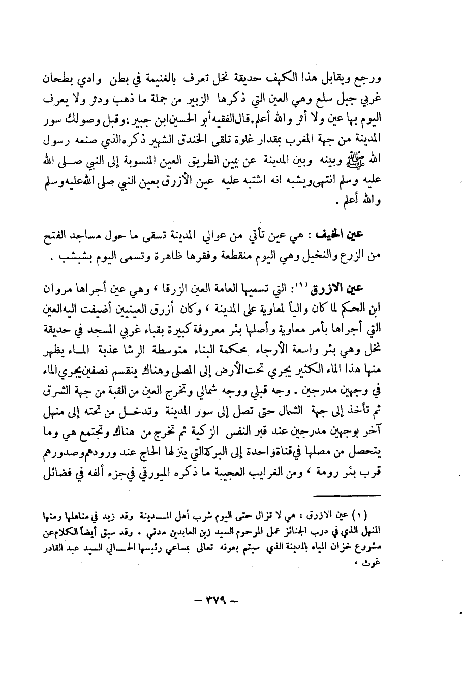 (1) عين الازرق: هي لا تزال حتى اليوم شرب أهل المدينة وقد زيد في مناهلها ومنها المنهل الذي في درب الجنائز عمل المرحوم السيد زين العابدين مدني. وقد سبق أيضاً الكلام عن مشروع خزان المياه بالمدينة الذي سيتم بعونه تعالى بمساعي رئيسها الحالي السيد عبد القادر غوث.