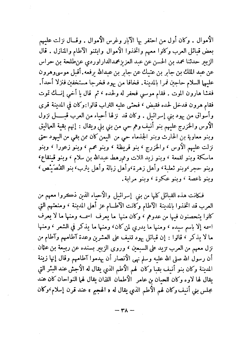 الأموال. وكان أول من احتفر بها الآبار وغرس الأموال. وقال نزلت عليهم بعض قبائل العرب واتخذوا الأموال وابتنوا الآطام والمنازل. قال الزبير حدثنا محمد بن الحسين عن عبد العزيز محمد الداراوردي عن طلحة بن حراس عن عبد الملك بن جابر بن عتيك عن جابر بن عبد الله يرفعه. أقبل موسى وهرون عليهما السلام حاجين فمرا بالمدينة. فخافا من يهود فخرجا مستخفيت فنزلا أحداً. فغشا هارون الموت. فقام موسي فحفر له ولحده، ثم قال يا أخي إنك تموت فقام هرون فدخل لحده فقبض، فحثى عليه التراب قالوا: وكان في المدينة قرى وأسواق من يهود بني إسرائيل.