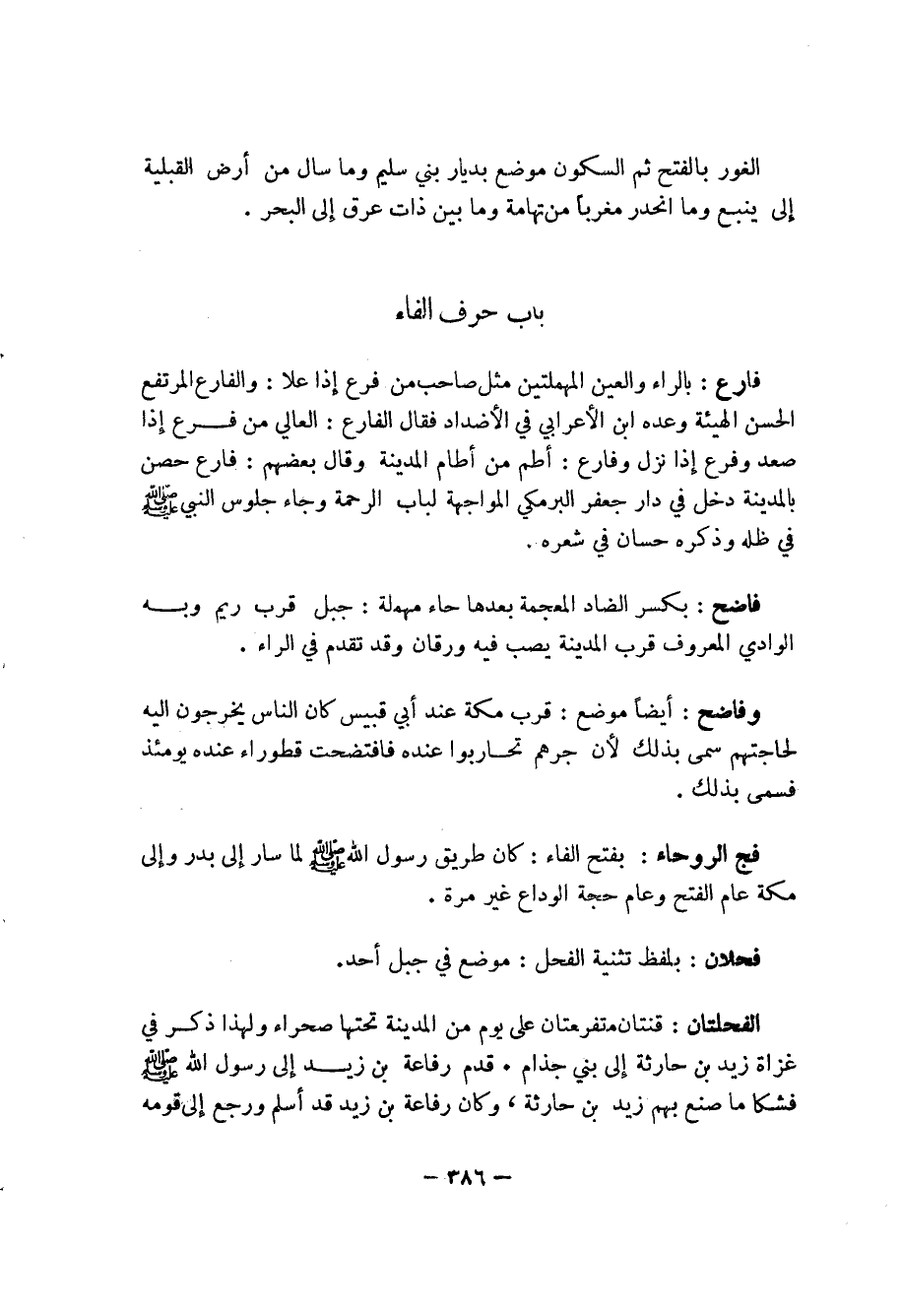 فارع: بالراء والعين المهملتين مثل صاحب من فرع إذا علا: والفارع المرتفع الحسن الهيئة وعدة ابن الأعرابي في الأضداد فقال الفارع: العالي من فرع إذا صعد وفرع إذا نزل وفارع: أطم من أطام المدينة وقالب عضهم: فارع حصن بالمدينة دخل في دار جعفر البرمكي المواجهة لباب الرحمة وجاء جلوس النبي صلى الله عليه وسلم في ظله وذكره حسان في شعره.