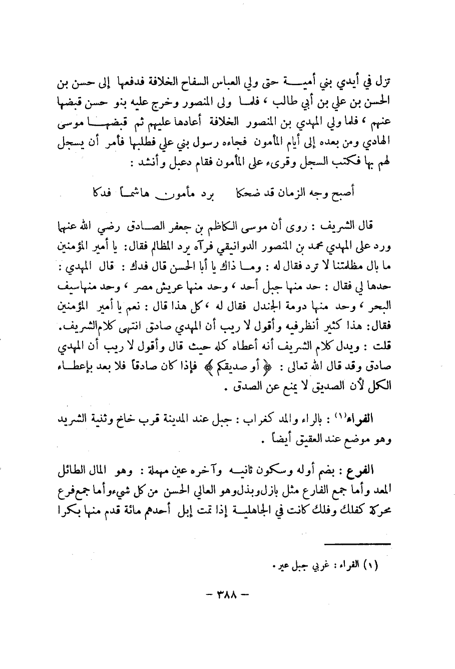 قال الشريف: روى أن موسى الكاظم بن جعفر الصادق رضي الله عنهما ورد على المهدي محمد بن المنصور الدوانيقي فرآه يرد المظالم فقال: يا أمير المؤمنين ماب ال مظلمتنا لا ترد فقال له: وما أذاك يا أبا الحسن قال فدك: قال المهدي: حدها لي فقال: حد منها جبل أحد، وحد منها عريش مصر، وحد منها سيف البحر، وحد منها دومة الجندل فقال له، كل هذا قال: نعم يا أمير المؤمنين فقال: هذا كثير أنظر فيه وأقول لا ريب أن المهدي صادق انتهى كلام الشريف.