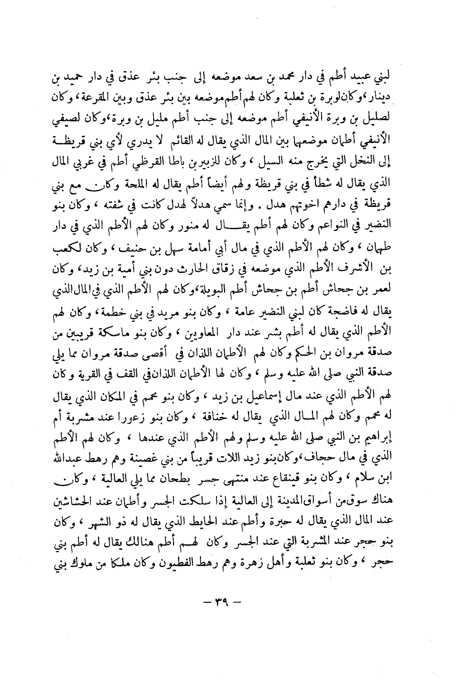 وإنما سمي هدلاً لهدل كانت في شفته، وكان بنو النضير في النواعم وكان لهم اطم يقال له منور وكان لهم الأطم الذي في دار طهمان، وكان لهم الأطم الذي في مال أبي أمامة سهل بن حنيف، وكان لكعب بن الأشرف الأطم الذي موضعه في زقاق الحارث دون بني أمية بن زبد، وكان لعمر بن جحاش أطم بن جحاش أطم البويلة، وكان لهم الأطم الذي في المال الذي يقال له فاضجة كان لبني النضير عامة، وكانوا بنو مريد في بني خطمة، وكان لهم الأطم الذي يقال له أطم بشر عند دار المعاويين، وكان بنو مريد في نبي خطمة، وكان لهم الأطم الذي يقال له أطم بشر عند دار المعاويين، وكان بنو ماسكة قريبين من صدقة مروان بن الحكم وكان لهم الأطمان اللذان في أقصى صدقة مروان مما يلي صدقة النبي صلى الله عليه وسلم، وكان لها الأطمان اللذان في القف في القرية وكان له الأطم الذي عند مال إسماعيل بن زيد، وكان بنو محمم في المكان الذي يقال له محمم وكان لهم المال الذي يقال له خناقة، وكان بنو زعورا عند مشربة أم إبراهيم بن النبي صلى الله عليه وسلم ولهم الأطم الذي عندها، وكان لهم الأطم الذي في مال حجاف، وكان بنو زيد اللات قريباً من بني غصينة وهم رهط عبد الله ابن سلام، وكان بنو قينقاع عند منتهى جسر بطحان مما يلي العالية، وكان هناك سوق من اسواق المدينة إلى العالية إذا سلكت الجسر وأطمان عند الحشاشين عند المال الذي يقال له ذو الشهر، وكان بنو حجر عند المشربة التي عند الجسر وكان لهم أطم هناك يقال له أطم بني حجر، وكان بنو ثعلبة وأهل زهرة وهم رهط الفطيون وكان ملكا من ملوك بني