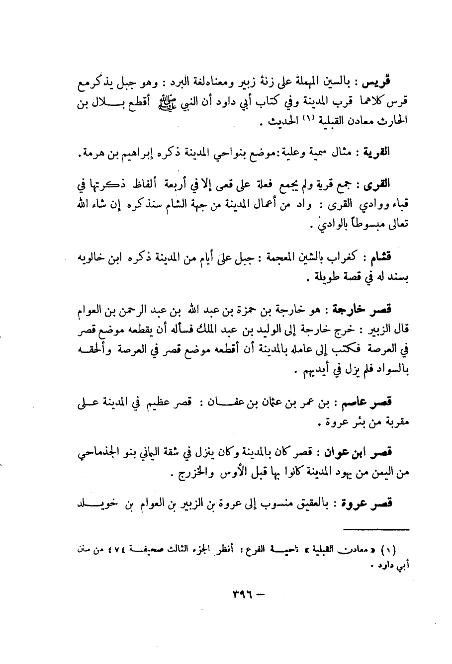 396 ... قريس: بالسين المهملة على زنة زبير ومعناه لغة البرد: وهو جبل يذكر مع قرس كلاهما قرب المدينة وفي كتاب أبي داود أن النبي صلى الله عليه وسلم أقطع بلال بن الحارث معادت القبلية (1) الحديث.