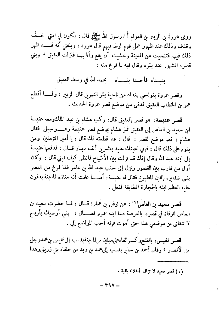 قصر سعيد بن العاص (1): عن نوفل بن عمارة قال: لما حضرت سعيد بن العاص الوفاء في قصره بالعرصة دعا ابنه عمرو فقال: ابني أوصيك بأربع لا تنقلنى من موضعي هذا حتى أموت فإنه أحب المواضع إلي.