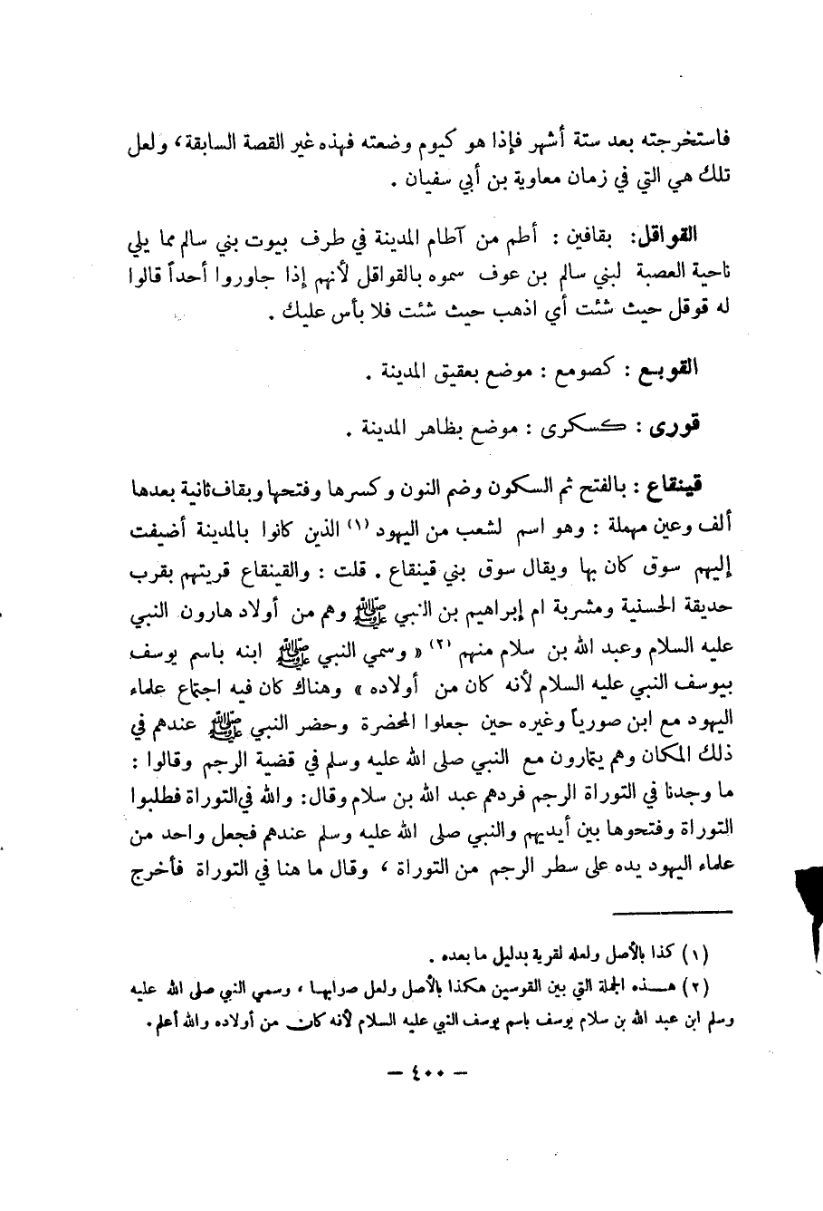 قلت: والقينقاع قريتهم بقرب حديقة الحسنية ومشربة ام إبراهيم بن النبي صلى الله عليه وسلم وهم من أولاد هارون النبي عليه السلام وعبد الله بن سلام منهم (2) (وسمي النبي صلى الله عليه وسلم ابنه باسم يوسف بيوسف النبي عليه السلام لأنه كان من أولاده) وهناك كان فيه اجتماع علماء اليهود مع ابن صورياً وغيره حين جعلوا المحضة وحضر النبي صلى الله عليه وسلم عندهم في ذلك لمكان وهم يتمارون مع النبي صلى الله عليه وسلمفي قضية الرجم وقالوا: ما وجدنا في التوارة الرجم فرهم عبد الله بن سلام وقال: والله في التوراة فطلبوا التوراة وفتحوها بين أيديهم والنبي صلى الله عليه وسلم عدهم فجعل واحد من علماء اليهود يده على سطر الرجم من التوراة، وقال ما هنا في التوارة فأخرج ...