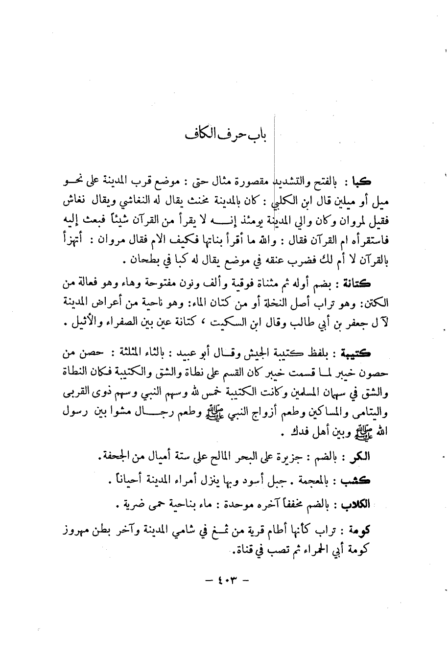 كبا: بالفتح والتشديد مقصورة مثال حتى: موضع قرب الميدنة على نحو ميل أو ميلين قال ابن الكلبي: كان بالمدينة مخنث يقال له النغاشي ويقال نغاش فقيل لمروان وكان والي المدينة يومئذ إنه لا يقرأ من القرآن شيئاً فبعث إليه فاستقرأه ام القرآن فقال: والله ما أقرأ بناتها فكيف الام فقال مروان: أتهزأ بالقرآن لا أم لك فضرب عنقه في موضع يقال له كبا في بطحان.