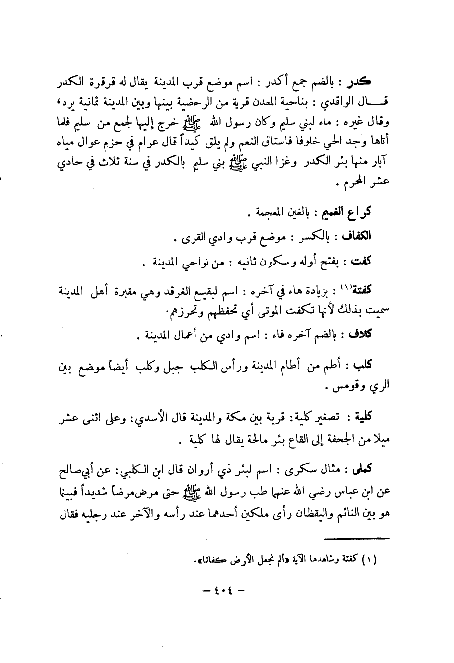 كفتة (1): بزيادة هاء في آخره: اسم لبقيع الغرقد وهي مقبرة أهل المدينة سميت بذلك لأنها تكفت الموتى أي تحفظهم وتحرزهم.