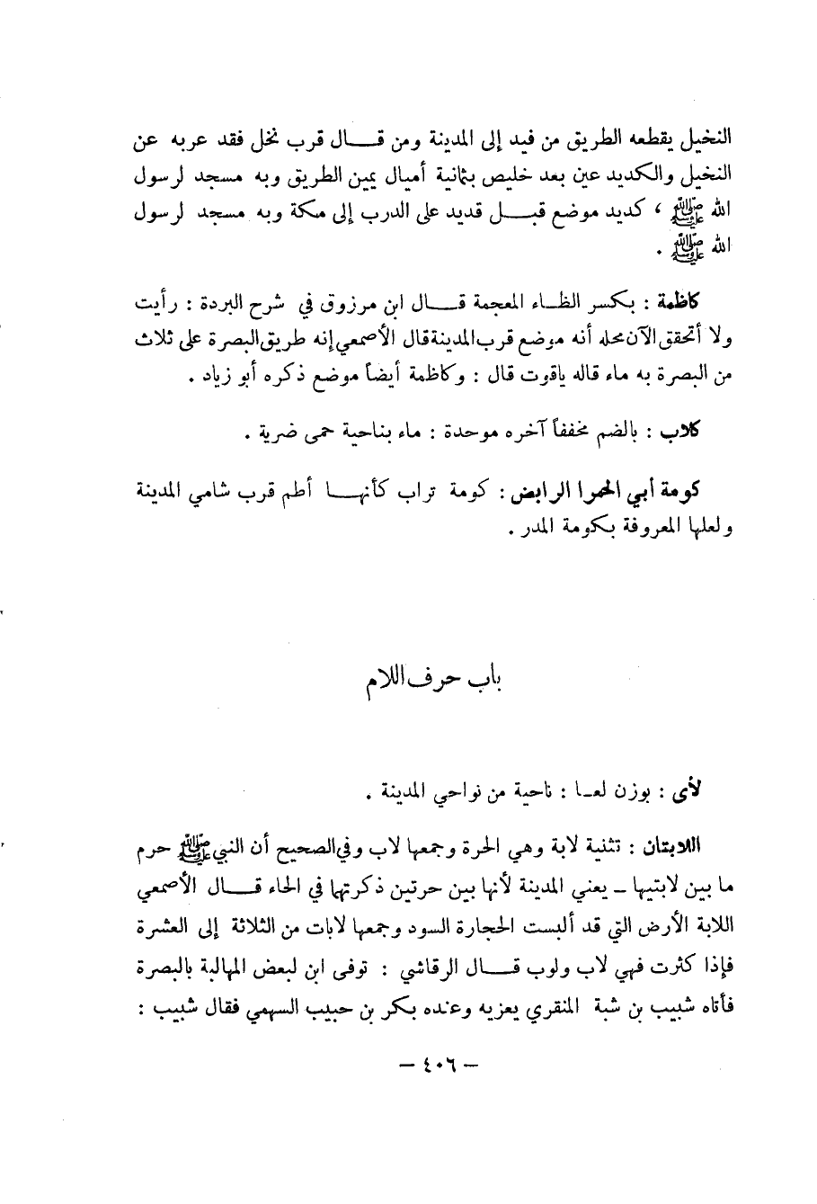 كاظمة: بكسر الظاء المعجمة قال ابن مرزوق في شرح البردة: رأيت ولا أتحقق الآن محله أنه موضع قرب المدينة قال الأصمعي إنه طريق البصرة على ثلاث من البصرة به ماء قاله ياقوت قال: وكاظمة أيضاً موضع ذكره أبو زياد.