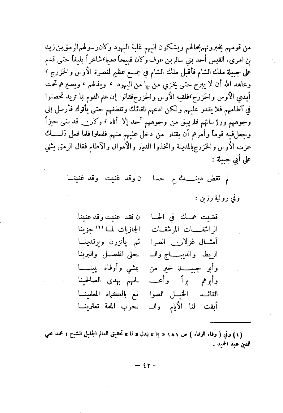 (1) وفي (وفاء الوفا) ص 181 (بما) بدل (لما) تحقيق العالم الجليل الشيخ: محمد محي الدين عبد الحميد.