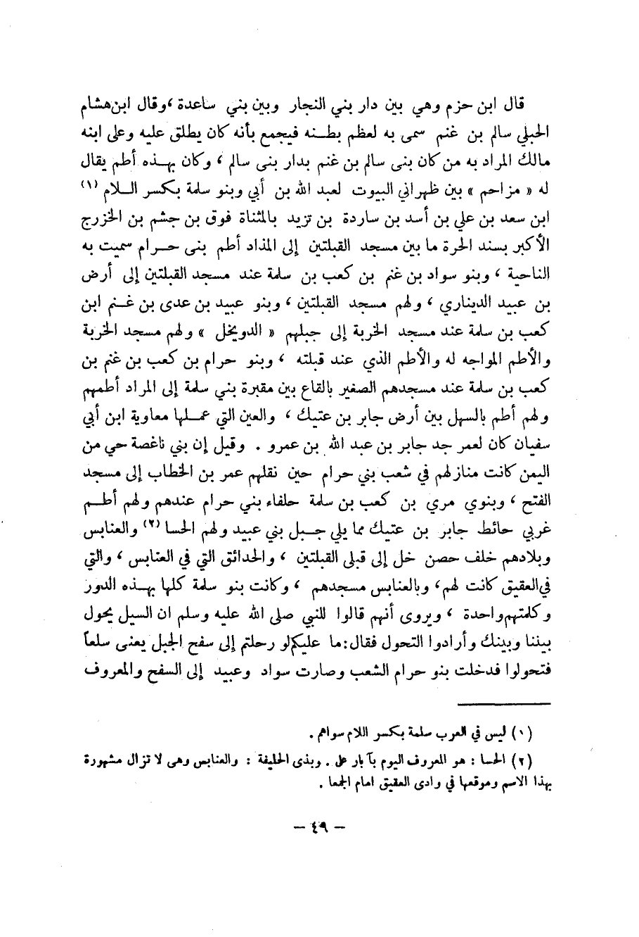 قال ابن حزم وهي بين دار بني النجار وبين بني ساعدة، وقال ابن هشام الحبلي سالم بن غنم سمى به لعظم بطنه فيجمع بأنه كان يطلق عليه وعلى ابنه مالك المراد به من كان بنى سالم بن غنم بدار بني سالم، وكان بهذا أطم يقال له (مزاحم) بين ظهراني البيوت لعبد الله بن أبي وبنو سلمة بكسر اللام (1) ابن سعد بن علي بن أسد بن ساردة بن تزيد بالمثناة فوق بن جشم بن الخزرج الأكبر بسند الحرة ما بين مسجد القبلتين إلى المذاد أطم بني حرام سميت به الناحية، وبنو سداد بن غنم بن كعب بن سلمة عند مسجد القبلتين إلى أرض بن عبيد الديناري، ولهم مسجد القبلتين، وبنو عبيد بن عدى بن غنم ابن كعب بن سلمة عند مسجد الخحربة إلى جبلهم (الدويخل) ولهم مسجد الخربة والأطم المواجه له والأطم الذي عند قبلته، وبنو حرام بن كعب بن غنم بن كعب بن سلمة عند مسجدهم الصغير بالقاع بين مقبرة بني سلمة إلى المراد أطمهم ولهم أطم بالسهل بين ارض جابر بن عتيك، والعين التي عملها معاوية ابن أبي سفيان كان لعمر جد جابر بن عبد الله بن عمرو.