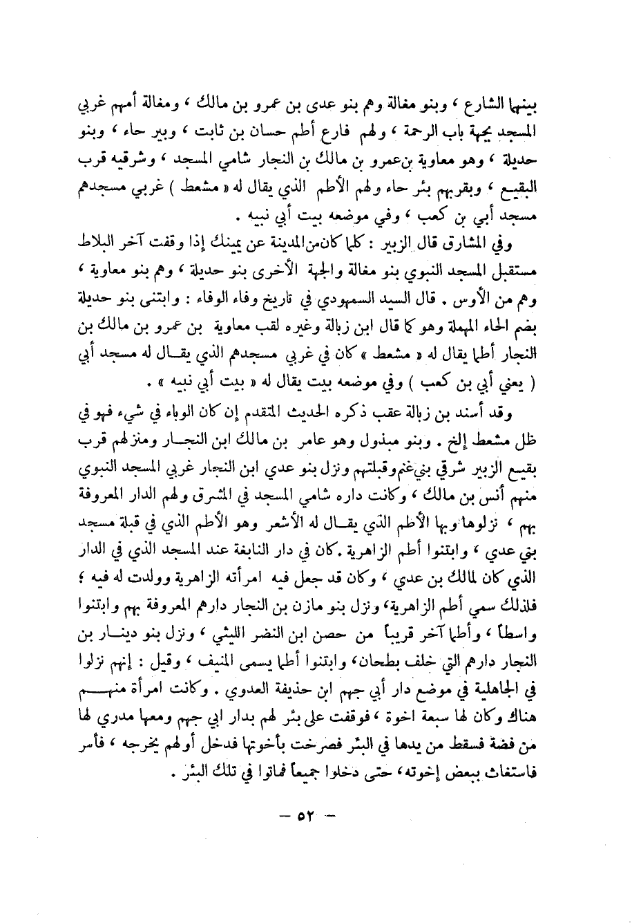 52 ... بينهما الشارع، وبنو مغالة وهم بنو عدى بن عمرة بن مالك، ومغالة امهم غربي المسجد بجهة باب الرحمة، ولهم فارع أطم حسان بن ثابت، وبير حاء، وبنو حديلة، وهو معاوية بن عمرة بن مالك بن النجار شامي المسجد، وشرقيه قرب البقيع، وبقربهم بئر حاء ولهم الأطم الذي يقال له (مشعط* غربي مسجدهم مسجد أبي بن كعب، وفي موضعه بيت أبي نبيه.