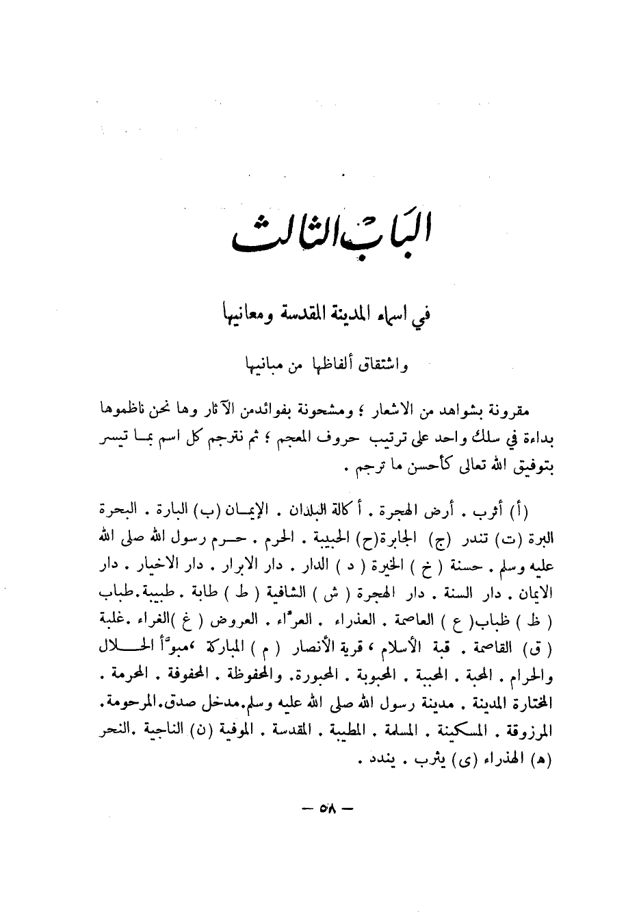 الباب الثالث في أسماء المدينة المقدسة ومعانيها واشتقاق ألفاظها من مبانيها مقرونة بشواهد من الاشعار؛ ومشحونة بفوائد من الآثار