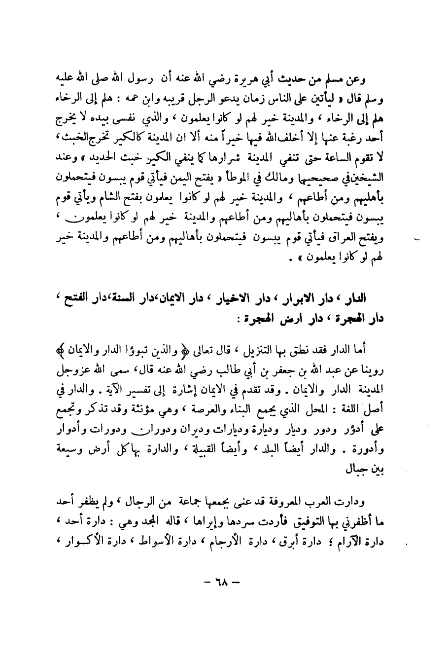 68 ... وعن مسلم عن حديث أبي هريرة رضي الله عنه أن رسول الله صلى الله عليه وسلم قال (ليأتين على الناس زمان يدعو الرجل قريبه وابن عمه: هلم إلى الرخاء هلم إلى الرخاء، والمدينة خير لهم لو كانوا يعلمون، والذي نفسي بيده لا يخرج أحد رغبة عنها إلا أخلف فيها خيراً منه ألا ان المدينة كالكير تخرج الخبث، لا تقوم الساعة حتى تنفى المدينة شرارها كما ينفي الكير خبث الحديد) وعند اشليخين في صحيحهما ومالك في الموطأ (يفتح اليمن فيأتي قوم يبسون فيتحملون بأهليهم ومن أطاعهم، والمدينة خير لهم لو كانوا يعلمون بفتح الشام ويأتي قوم يبسون فيتحملون بأهاليهم ومن اطاعهم والمدين خير لهم لو كانوا يعلمون، ويفتح العراق فيأتي قوم يبسون فيتحملون بأهاليهم ومن أطاعهم والمدين خير لهم لو كانوا يعلمون)).