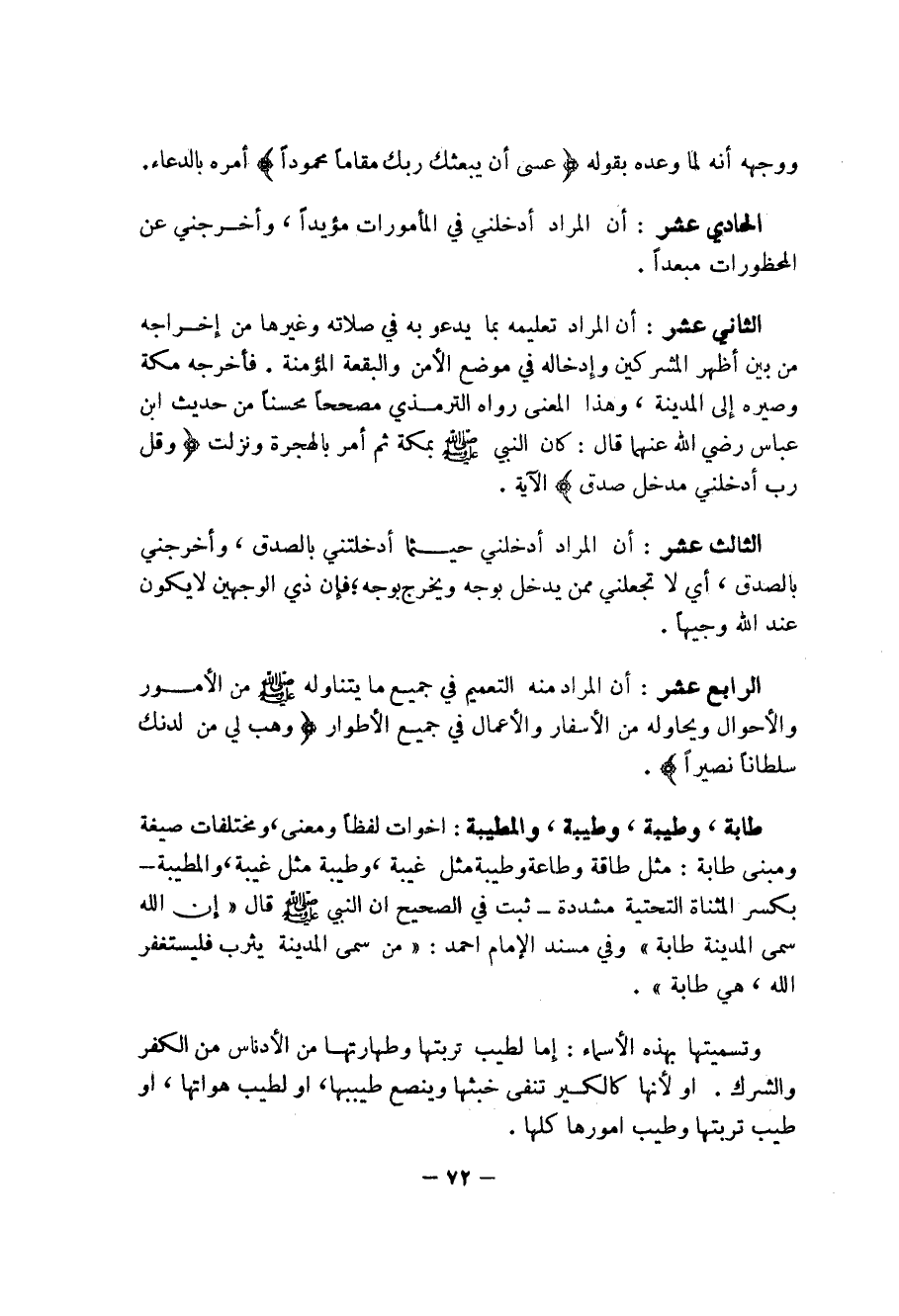 الثالث عشر: أن المراد ادخلني حيثما أدخلتني بالصدق، وأخرجني بالصدق، أي لا تجعلمي ممن يدخل بوجه ويخرج بوجه، فإن ذي الوجهين لا يكون عند الله وجيهاً.