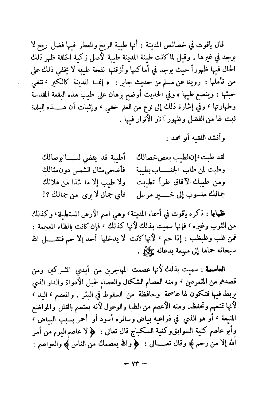 73 ... قال ياقوت في خصائص المدينة: أنها طيبة الريح وللعطر فيها فضل ربح لا يوجد في غيرها.