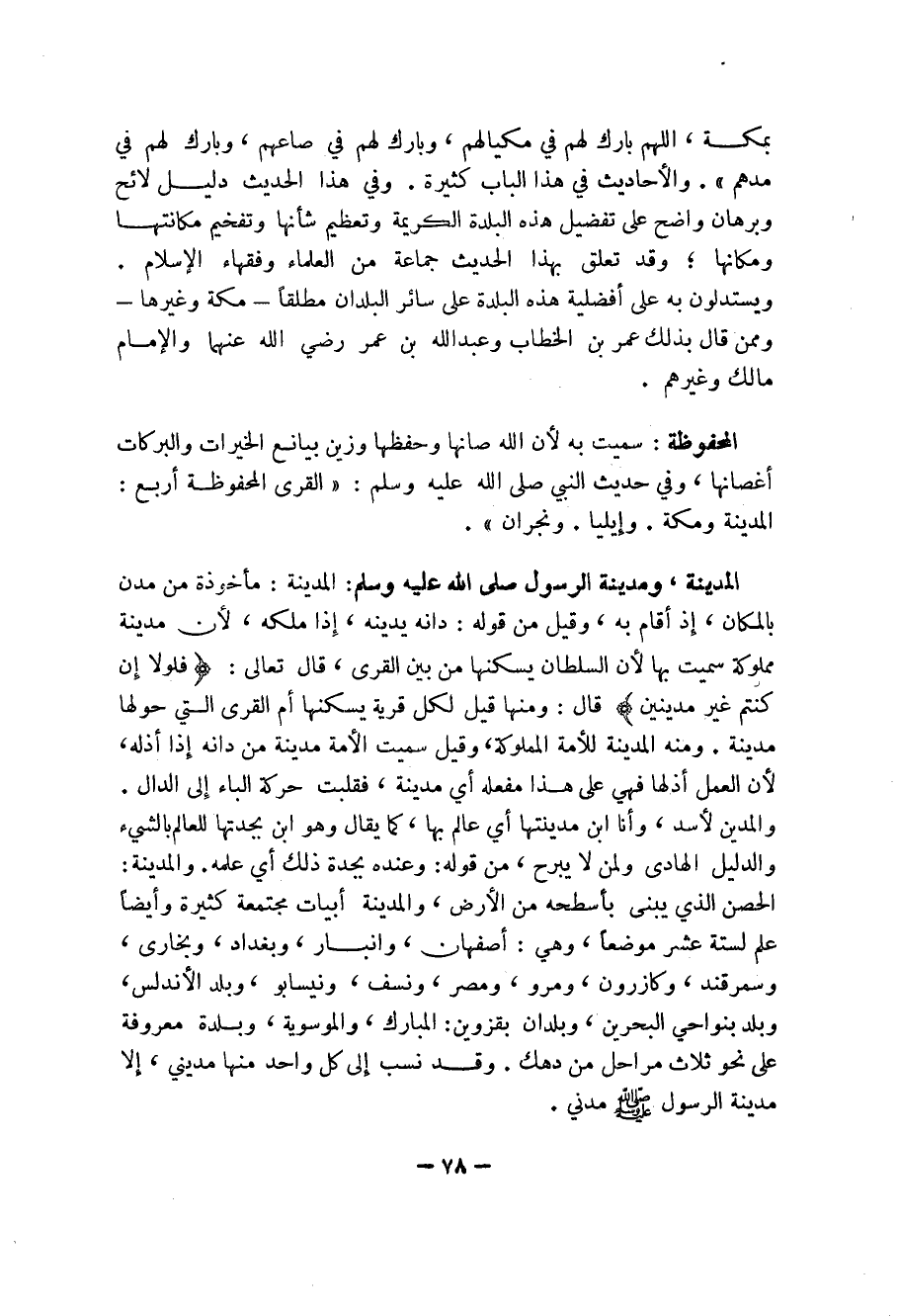 والمدينة: الحصن الذي يبنى بأسطحه من الأرض، والمدينة أبيات مجتمعة كثيرة وأيضاً علم لستة عشر موضعاً، وهي: أصفهان، وانبار، وبغداد، وبخارى، وسمرقند، وكازرون، ومرو، ومصر، ونسف، ونيسابو، وبلد الأندلس، وبلد بنواحي البحرين، وبلدان بقزوين: المبارك، والموسوية، وبلدة معروفة على تحو ثلاث مراحل من دهك.