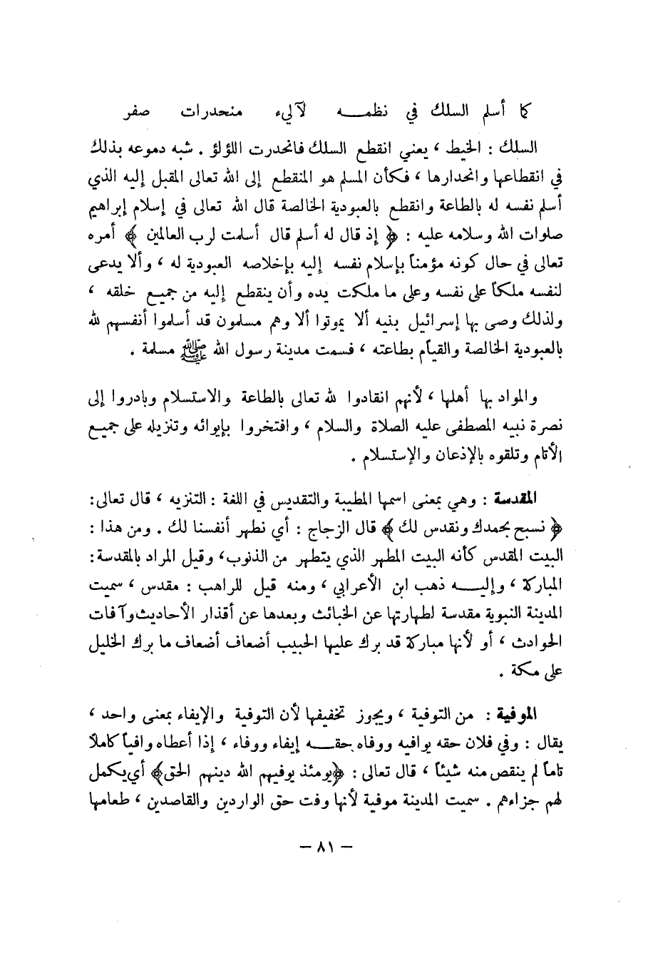 شبه دموعه بذلك في انقطاعها وانحدارها، فكأن المسلم هو المنقطع إلى الله تعالى المقبل إليه الذي أسلم نفسه له بالطاعة وانقطع بالعبودية الخالصة قال الله تعالى في إسلام إبراهيم صلوات الله وسلامه عليه: (إذا قال له اسلم قال أسلمت لرب العالمين) أمره تعالى في حال كونه مؤمناُ بإسلام إليه بإخلاصه العبودية له، وألا يدعى لنفسه ملكاً على نفسه وعلى ما ملكت يده وأن ينقطع إليه من جميع خلقه، ولذلك وصى بها إسرائيل بنيه ألا يموتوا ألا وهم مسلمون قد أسلموا أنفسهم لله بالعبودية الخالصة والقياًم بطاعته، فسمت مدينة رسول الله صلى الله عليه وسلم مسلمة.