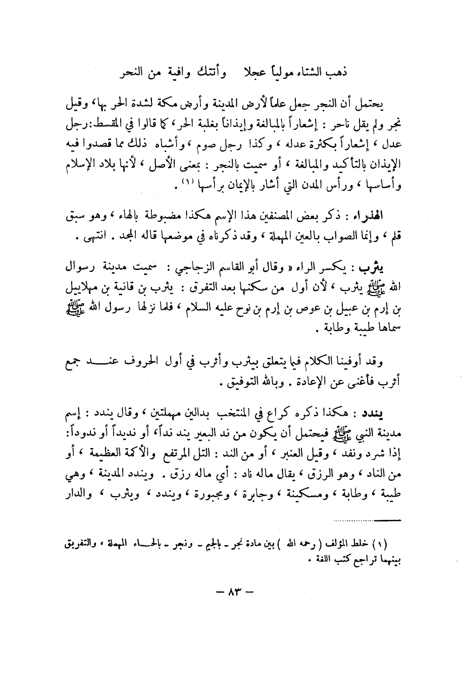 يحتمل أن النجر جعل علماً لأرض المدينة وأرض مكة لشدة الحر بها، وقيل نجر ولم يقل ناحر: إشعاراً بالمبالغة وإيذاناً بغلبة الحر، كما قالوا في المقسط: رجل عدل، إشعاراً بكثرة عدله، وكذا رجل صوم، وأشباه ذلك مما قصدوا فيه الإيذان بالتأكيد والمبالغة، أو سميت بالنجر: بمعنى الأصل، لأنها بلاد إسلام وأساسها، ورأس المدن التي أشار بالإيمان برأسها (1).