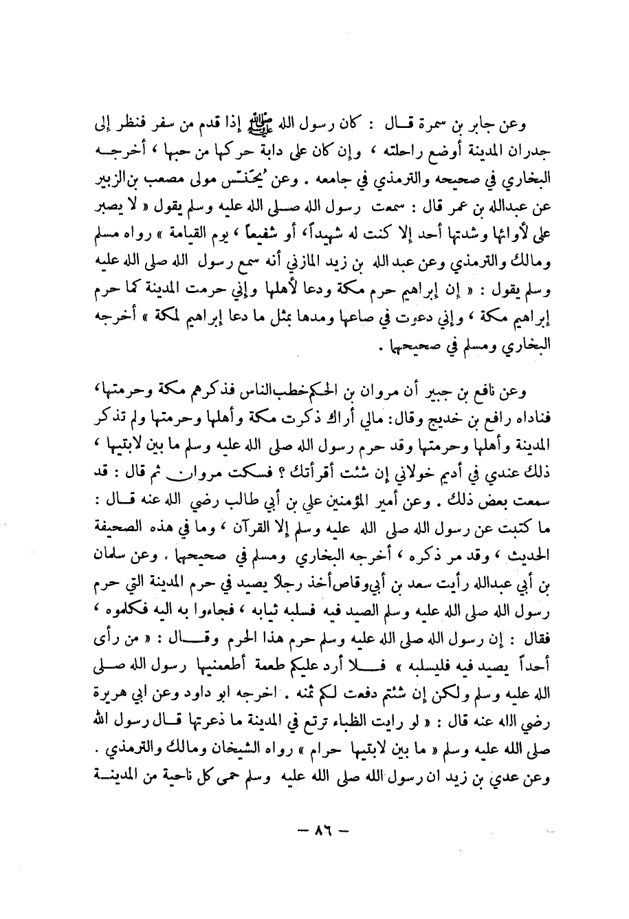 وعن يُحَنّس مولى صعب بن الزبير عن عبد الله بن عمر قال: يمعت رسول الله صلى الله عليه وسلم يقول (لا يصبر على لأوائها وشدتها أحد إلا كنت له شهيداً، او شفيعاً، يوم القيامة) رواه مسلم ومالك والترمذي وعن عبد الله بن زيد المازني أنه سمع رسول الله صلى الله عليه وسلم يقول: (إن إبراهيم حرم مكة ودعا لأهلها وإني حرمت المدينة كما حرم إبراهيم مكة، وإني دعوت في صاعها ومدها بمثل ما دعا إبراهيم لمكة) أخرجه البخاري ومسلم في صحيحهما.