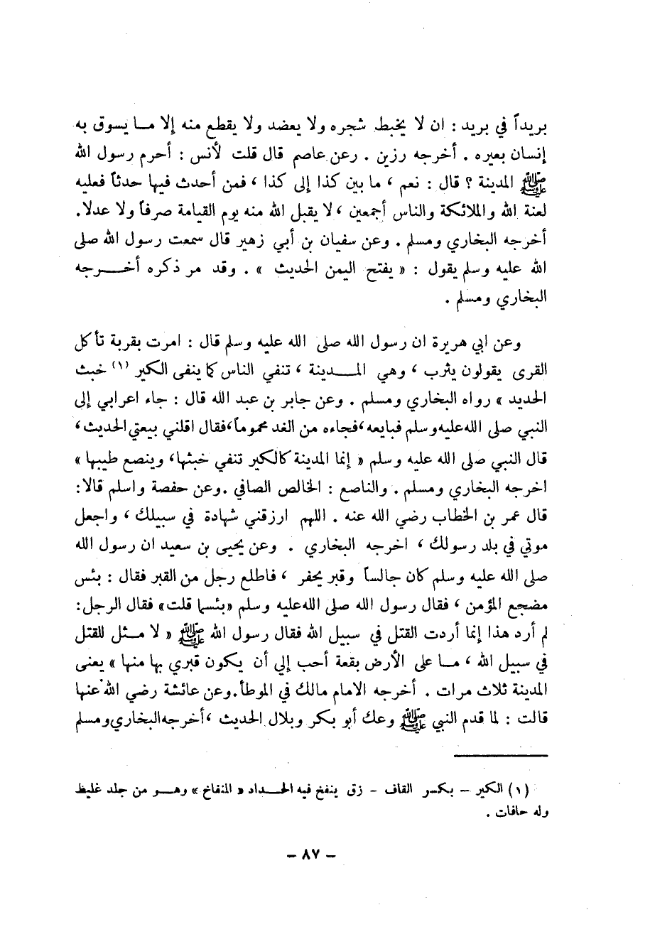 87 ... بريداً في بريد: ان لا يخبط شجره ولا يعضد ولا يقطع منه إلا ما يسوق به إنسان بعيره. أخرجه رزين.