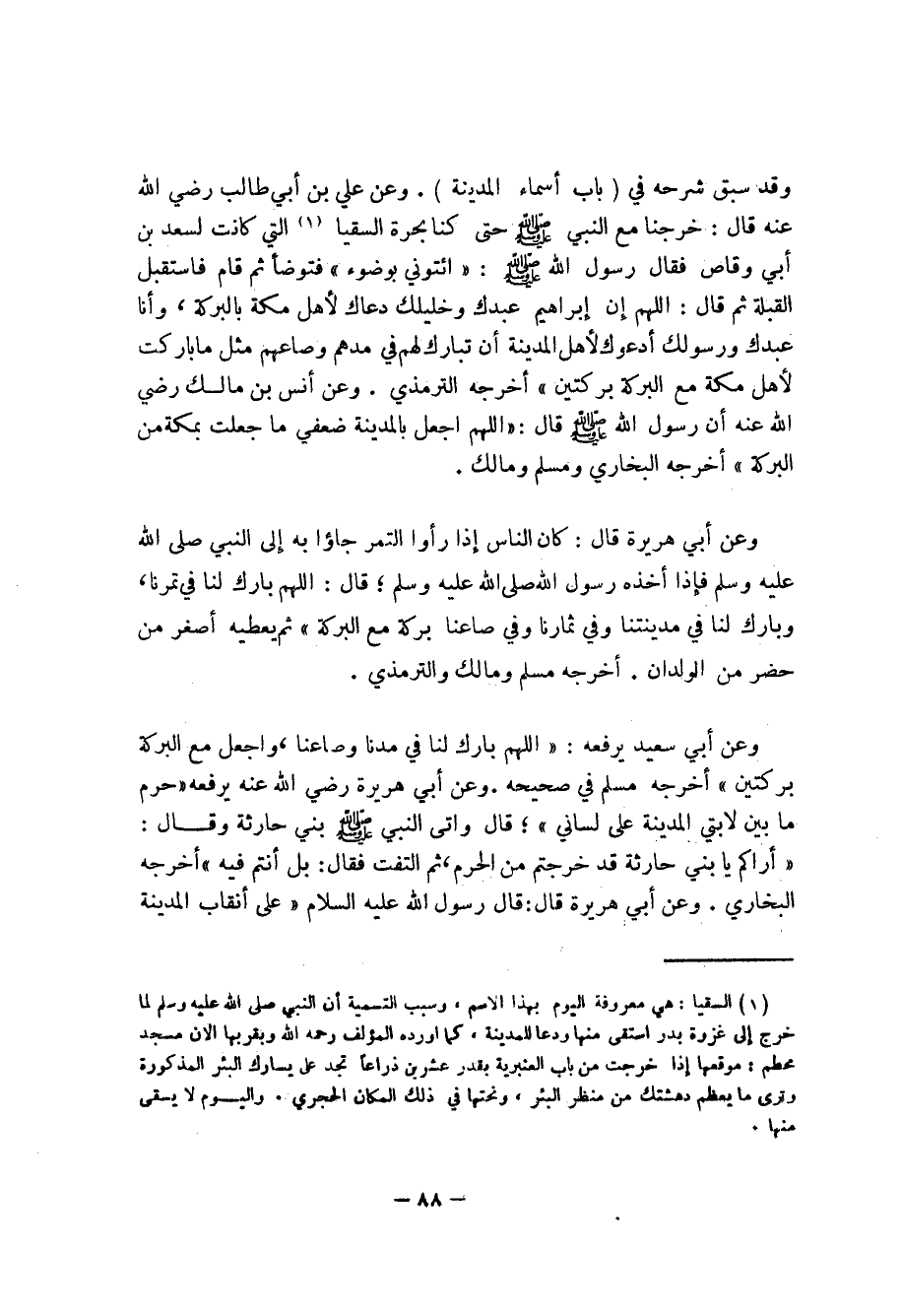 88 ... وقد سبق شرحه في (باب أسماء المدينة). وعن علي بن أبي طالب رضي الله عنه قال: خرجنا مع النبي صلى الله عليه وسلم حتى كنا بحرة السقا (1) التي كانت لسعد بن أبي وقاص فقال رسول اللهخ صلى الله عليه وسلم: (ائتوني بوضوء) فتوضأ ثم قام فاستقبل القبلة ثم قال: اللهم إن إبراهيم عبدك دعاك لأهل مكة بالبركة، وأنا عبدك ورسولك أدعوك لأهل المدينة أن تبارك لهم في مدهم وصاعهم مثل ما باركت لأهل مكة مع البركة بركتين) أخرجه الترمذي.