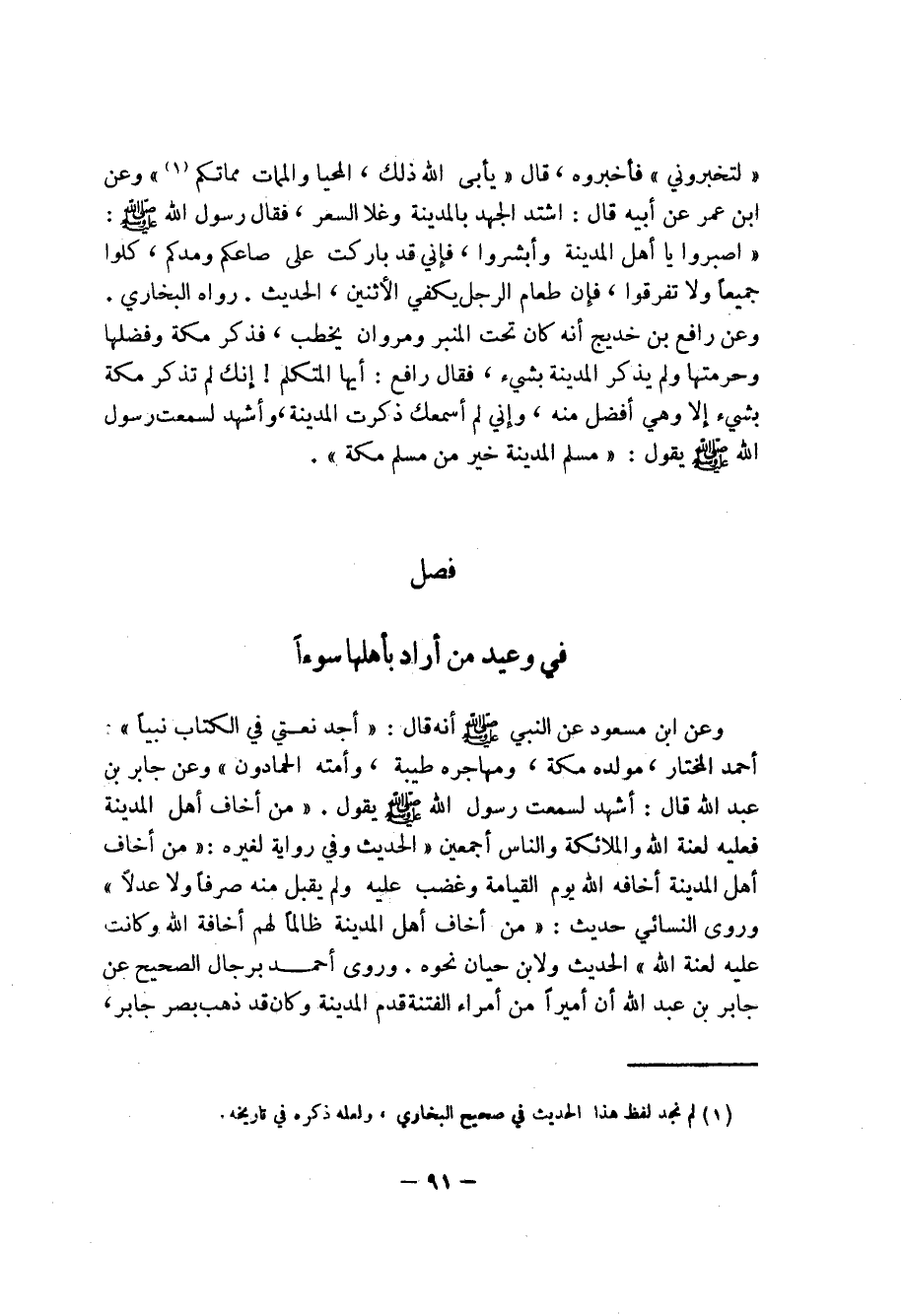 (من أخاف أهل المدينة فعليه لعنة الله والملائكة والناس أجمعين (الحديث وفي رواية لغيره: (من أخاف أهل المدينة أخافه الله يوم القيامة وغضب عليه ولم يقبل منه صرفاً ولا عدلاً) وروى النسائي حديث: (من أخاف أهل المدينة ظالماً لهم أخافه الله وكانت عليه لعنة الله) الحديث ولابن حيان نحوه.