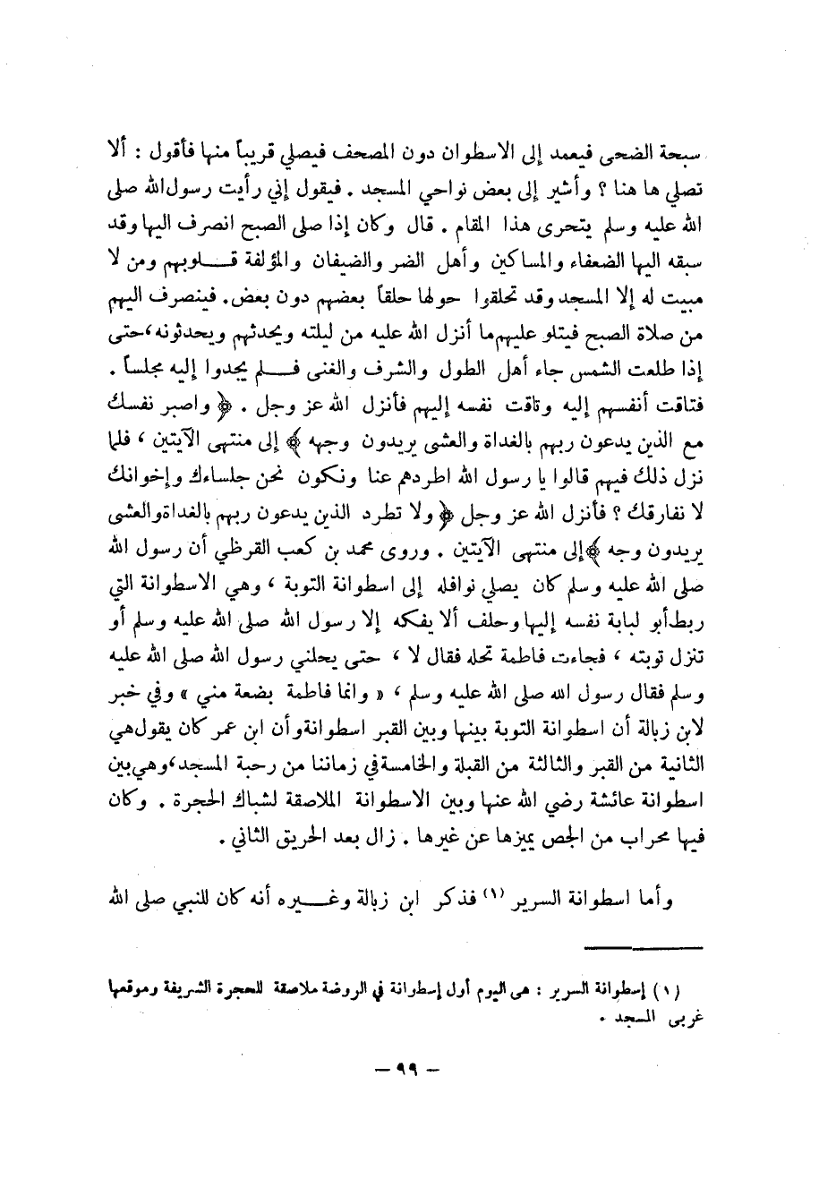 99 ... سبحة الضحى فيعمد إلى الاسطوان دون المصحف فيصلي قريبا منها فأقول: ألا تصلي ها هنا؟ وأشير إلى بعض نواحي المسجد. فيقول إني رأيت رسول الله صلى الله عليه وسلم يتحرى هذا المقام. قال وكان إذا صلى الصبح انصرف اليها وقد سبقه اليها الضعفاء والمساكين وأهل الضر والضعيفان والمؤلفة قلوبهم ومن لا مبيت له إلا المسجد وقد تحلقوا حولها حلقاً بعضهم دون بعض.