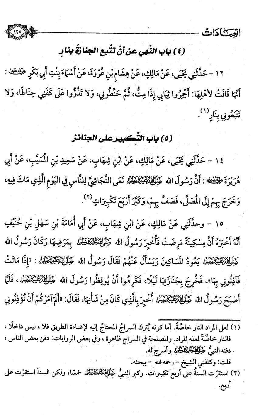 14 - حدثني يحيى، عن مالك، عن ابن شهاب، عن سعيد بن المسيب، عن أبي هريرة - رضي الله عنه -: أن رسول الله - صلى الله عليه وسلم - نعى النجاشي للناس في اليوم الذي مات فيه، وخرج بهم إلى المصلى، فصف بهم، وكبر أربع تكبيرات (¬2).