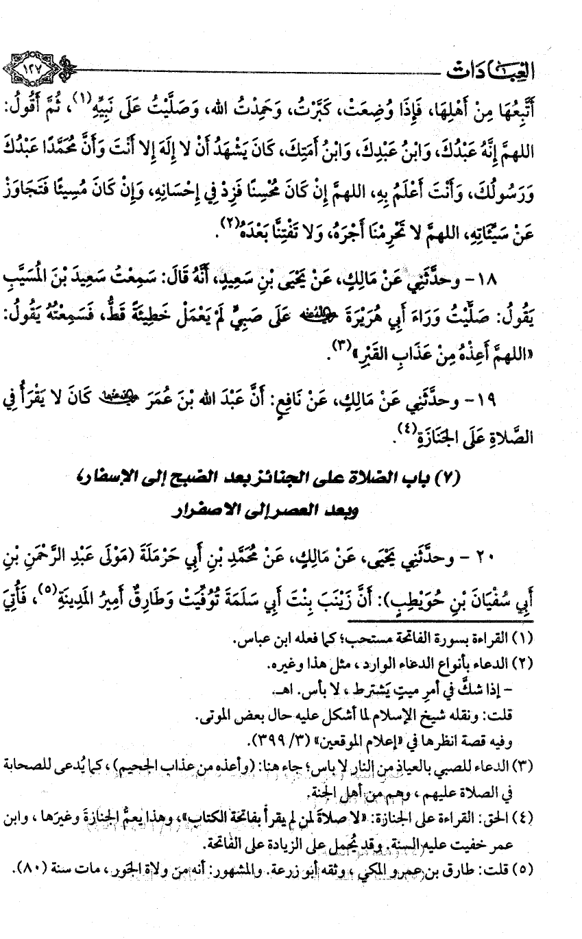 19 - وحدثني عن مالك، عن نافع: أن عبد الله بن عمر - رضي الله عنه - كان لا يقرأ في الصلاة على الجنازة (¬4).