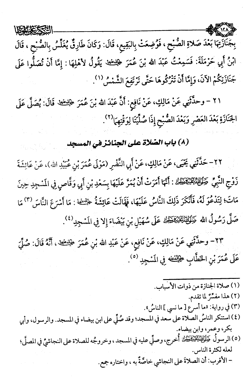 23 - وحدثني عن مالك، عن نافع، عن عبد الله بن عمر - رضي الله عنه -، أنه قال: صلي على عمر بن الخطاب - رضي الله عنه - في المسجد (¬5).