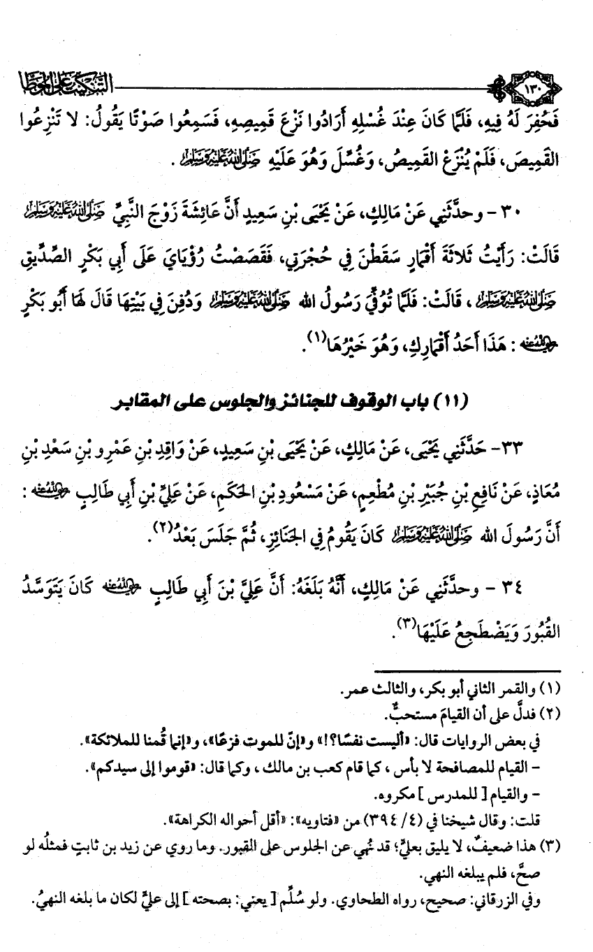 34 - وحدثني عن مالك، أنه بلغه: أن علي بن أبي طالب - رضي الله عنه - كان يتوسد القبور ويضطجع عليها (¬3).