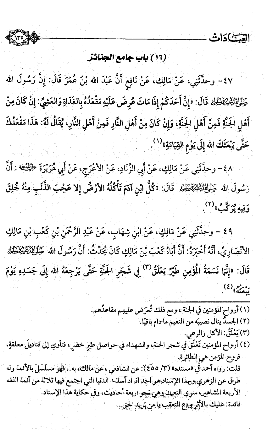 49 - وحدثني عن مالك، عن ابن شهاب، عن عبد الرحمن بن كعب بن مالك الأنصاري، أنه أخبره: أن أباه كعب بن مالك كان يحدث: أن رسول الله - صلى الله عليه وسلم - قال: «إنما نسمة المؤمن طير يعلق (¬4) في شجر الجنة حتى يرجعه الله إلى جسده يوم يبعثه» (¬5).