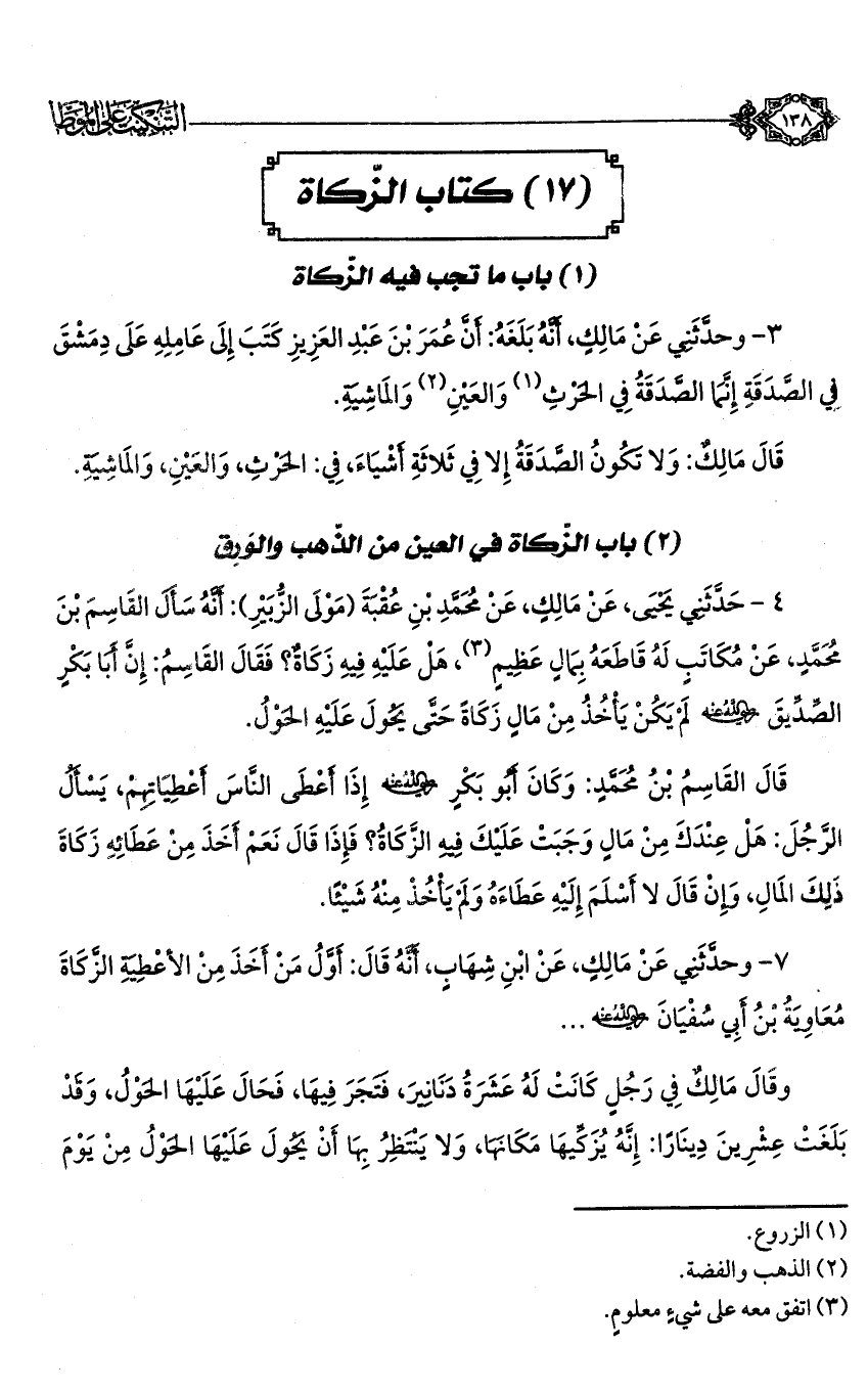 3 - وحدثني عن مالك، أنه بلغه: أن عمر بن عبد العزيز كتب إلى عامله على دمشق في الصدقة إنما الصدقة في الحرث (¬1) والعين (¬2) والماشية.