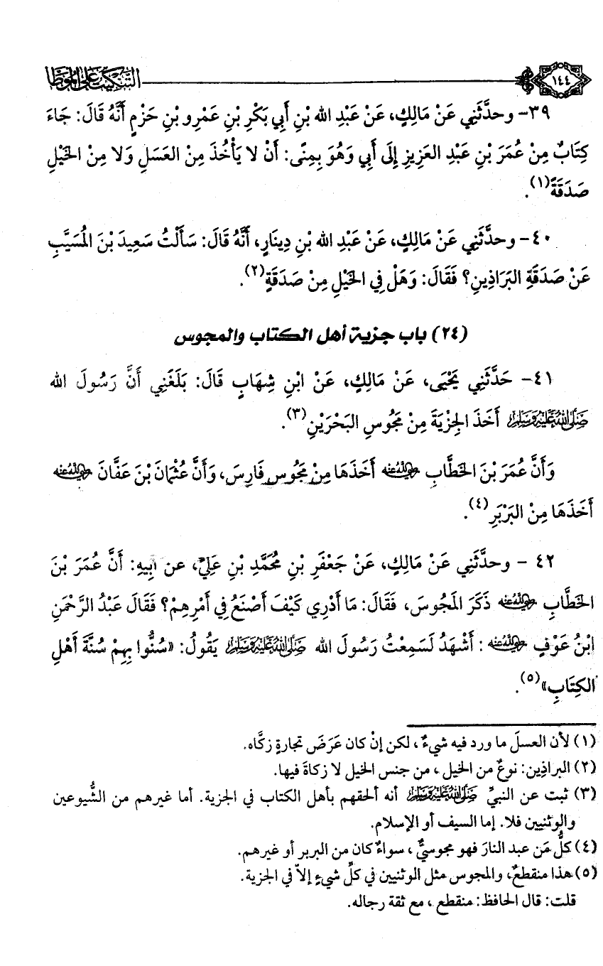 42 - وحدثني عن مالك، عن جعفر بن محمد بن علي، عن أبيه: أن عمر بن الخطاب - رضي الله عنه - ذكر المجوس، فقال: ما أدري كيف أصنع في أمرهم؟ فقال عبد الرحمن ابن عوف - رضي الله عنه -: أشهد لسمعت رسول الله - صلى الله عليه وسلم - يقول: «سنوا بهم سنة أهل الكتاب» (¬5).